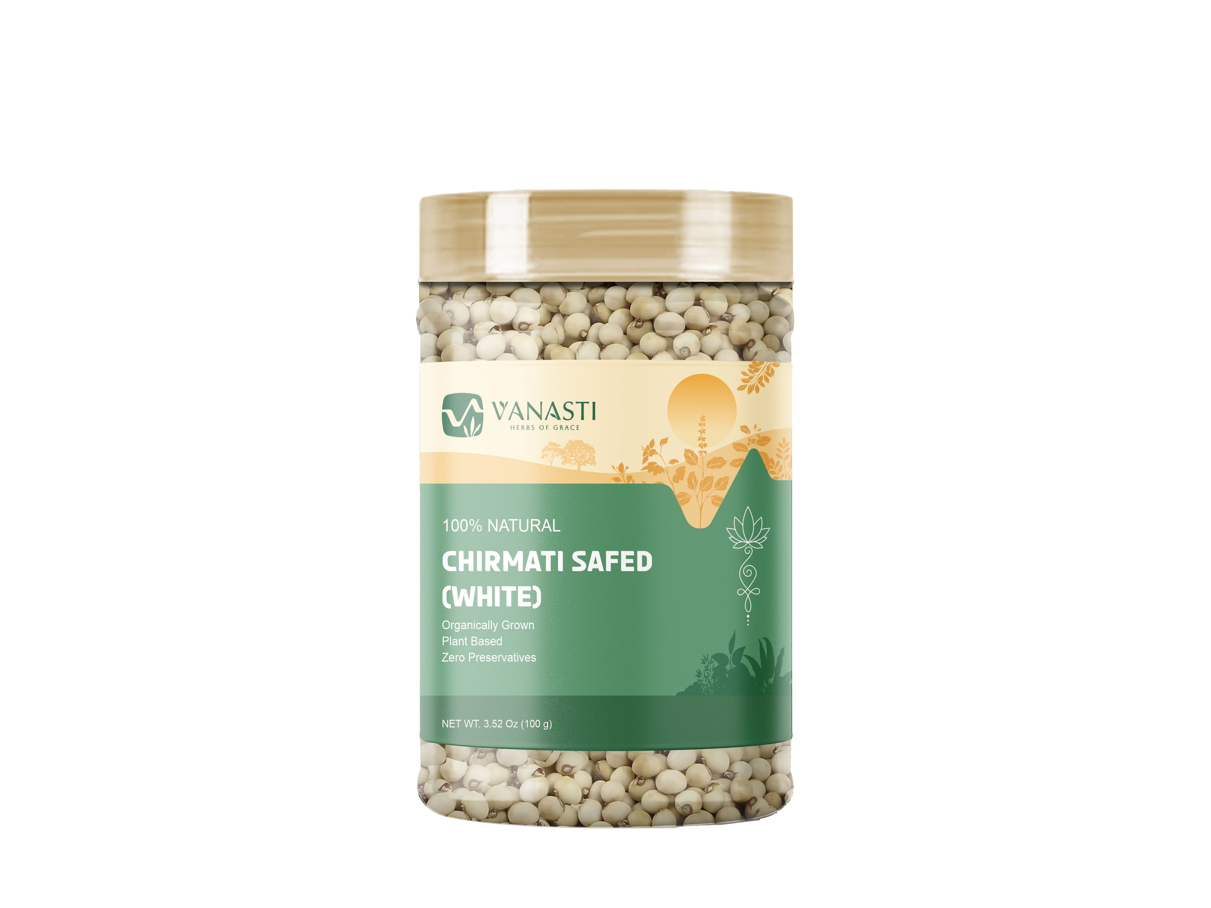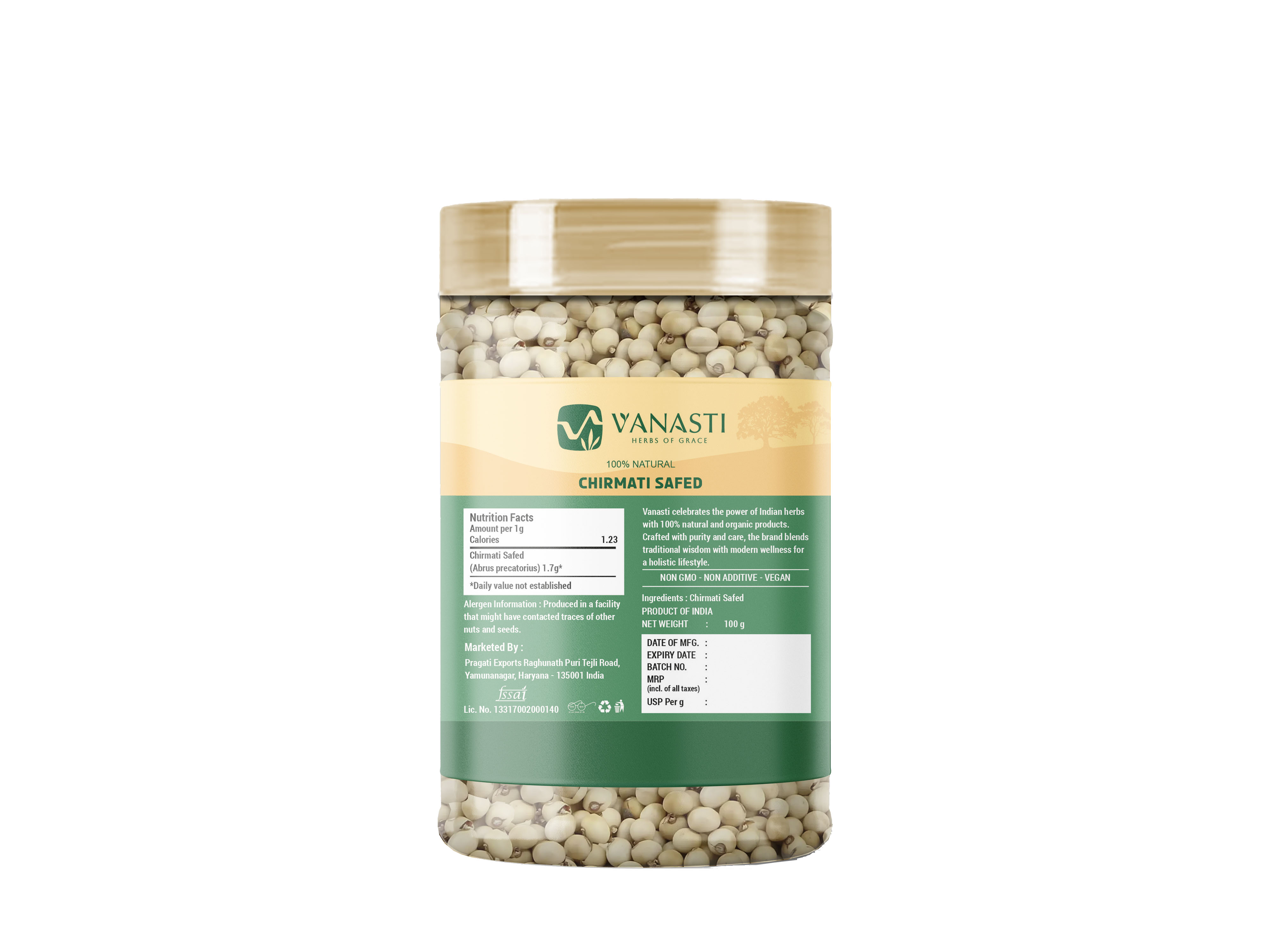 Chirmati Safed, also known as Ratti Safed or Abrus precatorius, is a perennial vine found in tropical regions such as India. It has slender, twining stems and produces small, oval white seeds traditionally used in folk practices and household rituals. While the seeds are noted for their distinct appearance and protein content, they also contain abrin alkaloids, which are highly toxic and handled with care. Chirmati Safed remains significant in cultural contexts, especially in symbolic and ritual blends.