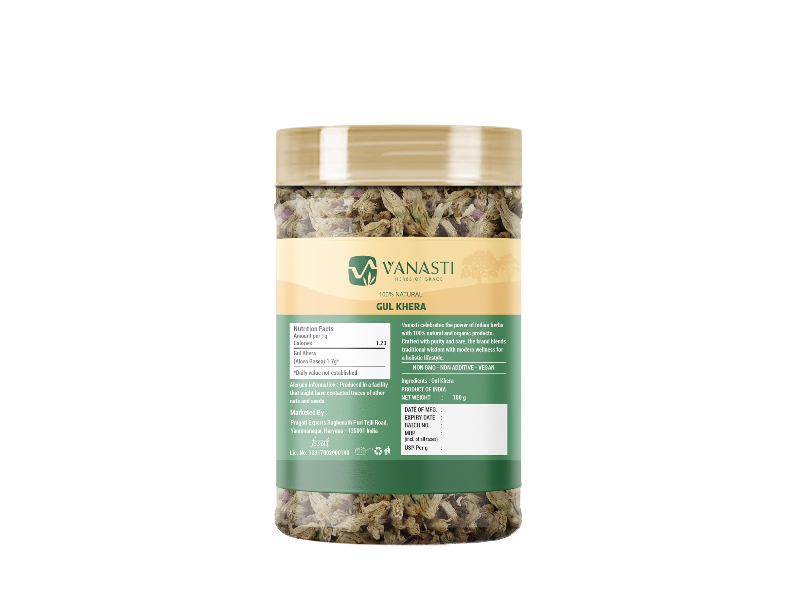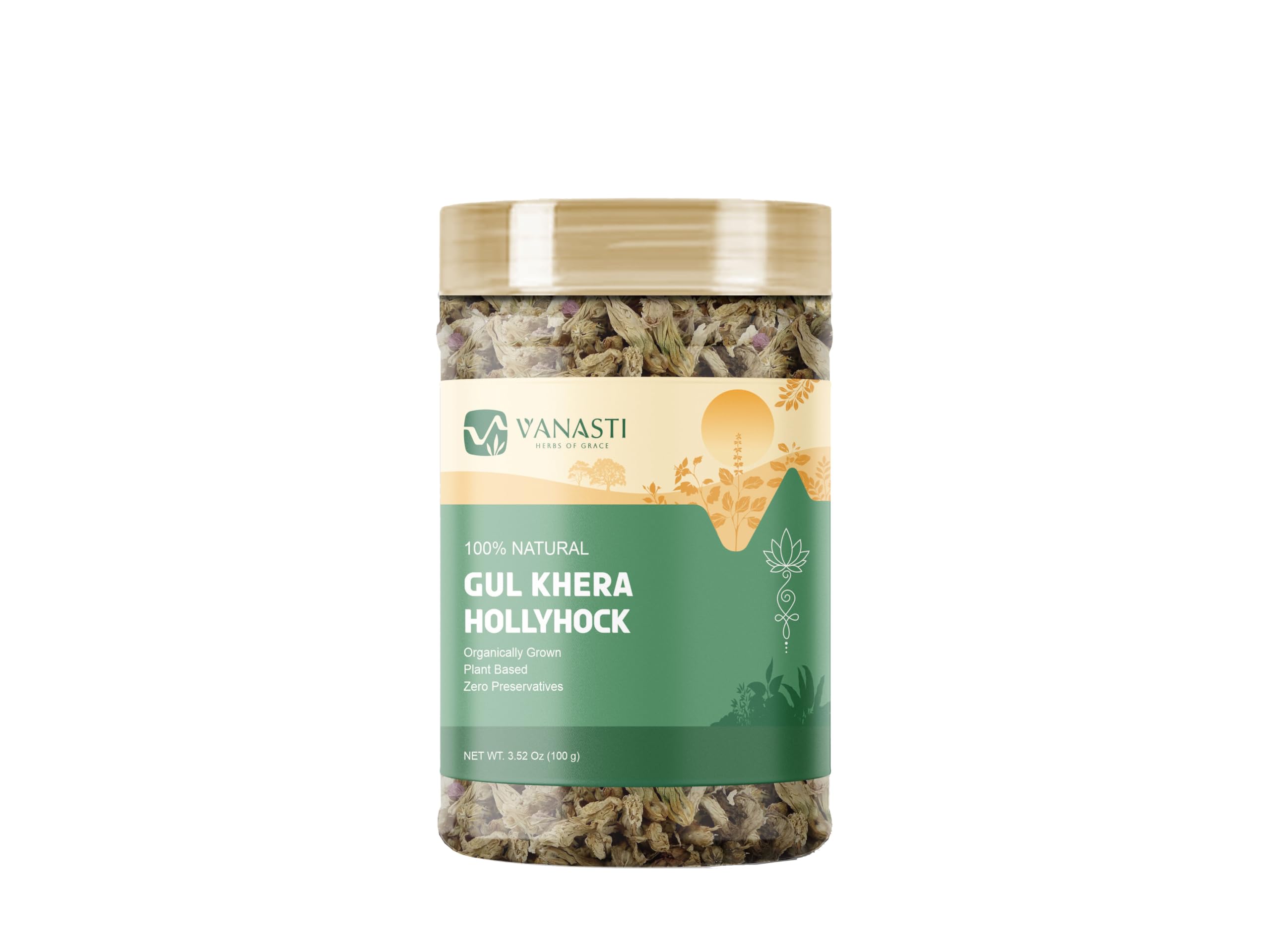 Gul Khera (Alcea rosea), also known as hollyhock, is a striking flowering plant native to Asia and Eastern Europe. It features tall stems topped with large, colorful blooms in shades of pink, red, and white. For generations, Gul Khera has been grown in gardens and used in traditional preparations, especially for soothing skin and as part of herbal blends.The petals and leaves naturally contain plant mucilage and flavonoids, which contribute to their soft texture and vibrant color. Gul Kheras enduring role in regional customs highlights its value in both decorative and traditional uses.