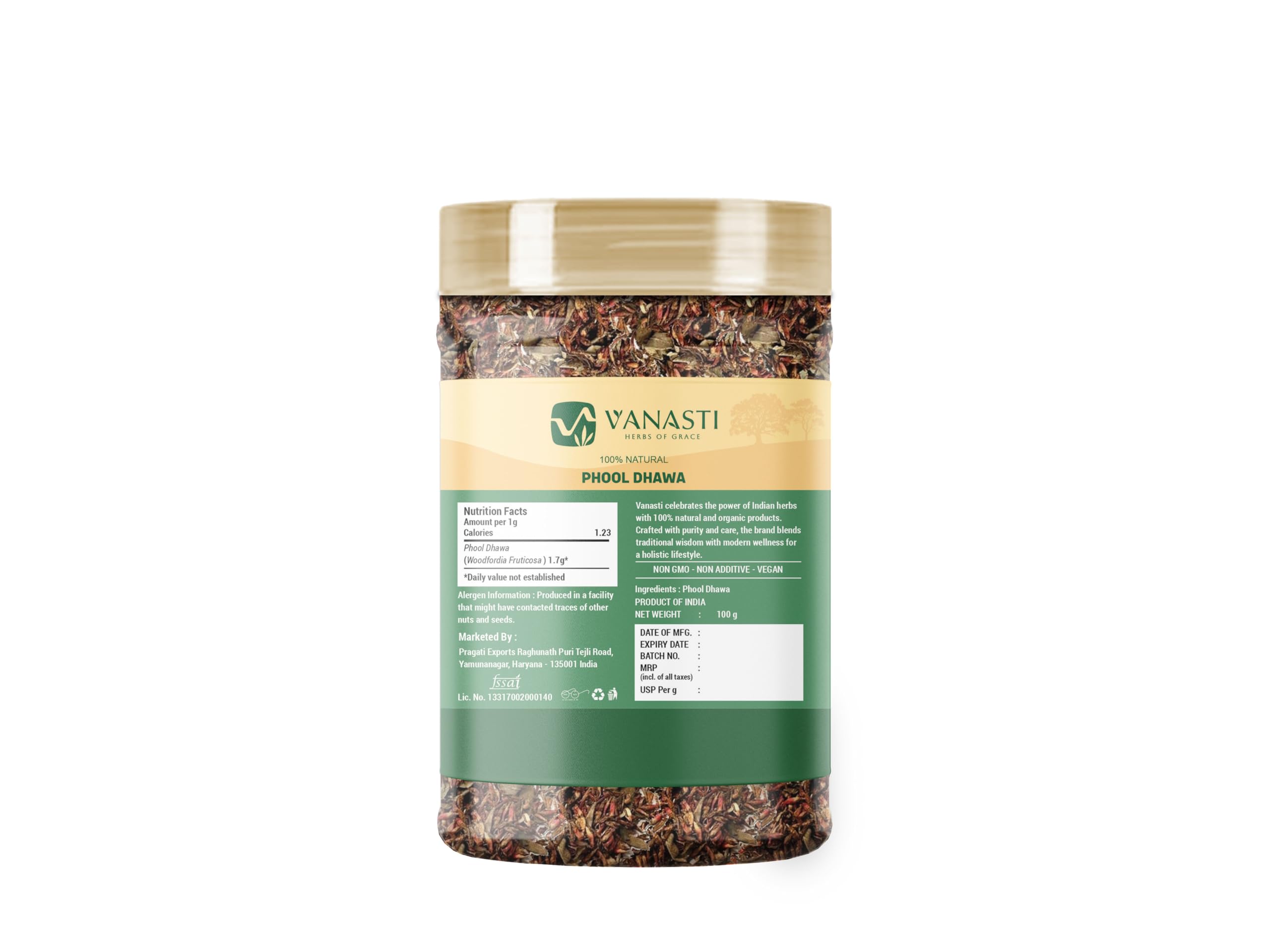 Phool Dhawa (Dhawai Flower, Dhataki Phool, Woodfordia fruticosa) is a flowering shrub found across South and Southeast Asia. It is known for its vibrant red blossoms and mild fragrance. The flowers contain flavonoids, polyphenols, and natural pigments, and are sometimes used in teas, blends, or as a natural dye.