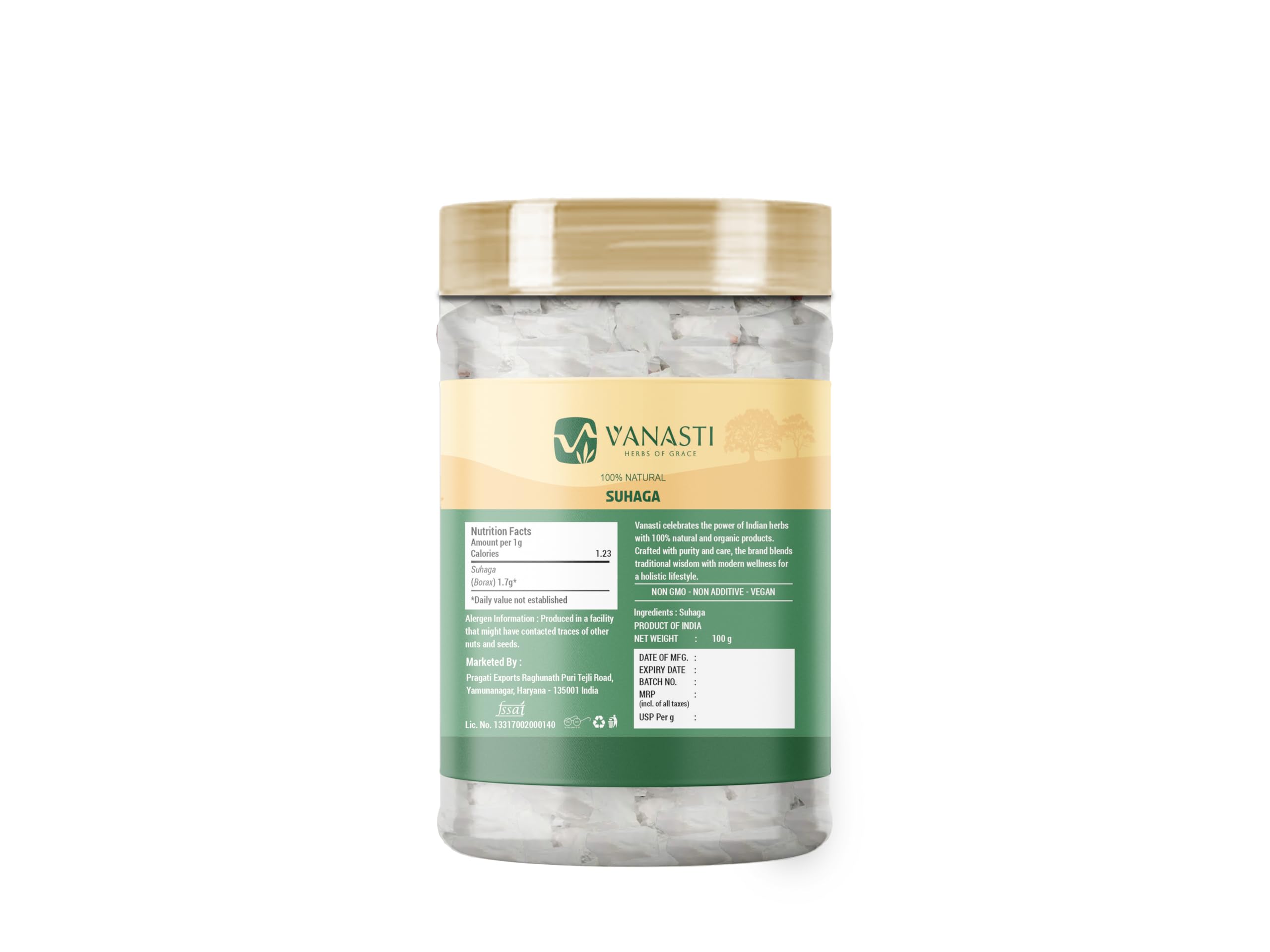 Suhaga, or Tankan Bhasma, is a mineral known as borax.It appears as white or translucent crystals with a smooth texture.Suhaga is recognized for its unique physical characteristics.The mineral is sometimes included in traditional preparations for its sensory qualities.It is valued for its neutral, mineral composition in various artisan uses.Suhaga stands out for its distinct appearance and texture.