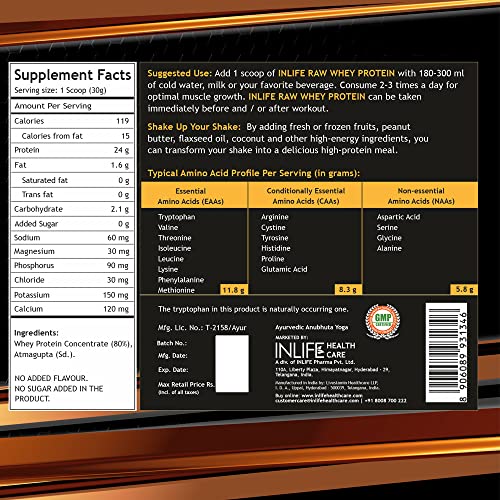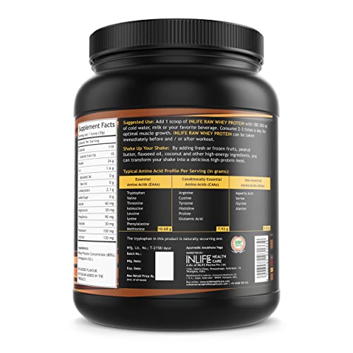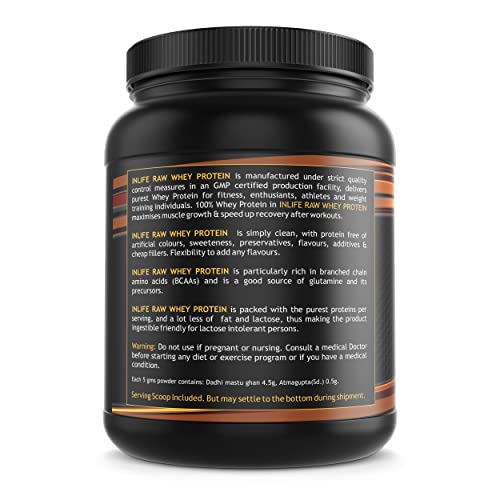 Flavor:1kg (Unflavoured)RAW WHEY PROTEIN: INLIFE Raw Whey Protein Concentrate 80% instantized is a single ingredient product that's clean & pure whey protein powder. No fillers No sugar added Only Raw whey protein powder. It contains 24 grams protein in a single serving of 30 grams. FORMULA TARGETS OPTIMUM MUSCLE GROWTH and DEVELOPMENT: When an athlete takes Natural Raw Whey the body can absorb more free amino acids directly into the muscle tissue which helps to increase muscle size strength and lean body mass.PERFECT NUTRITION: It contains all the essential and non-essential amino acids required by the human body. Beneficial to exceptionally healthy athlete to teenagers less active individuals as well as elderly. HIGH IN AMINO ACIDS: Its high in BCAA's and EAAS they help to protect your muscles increase muscle mass resistance and help with your overall hormonal environment.Quality MUSCLE FOOD: INLIFE Raw Whey is fast absorbing and has a clean profile to help you reach your nutrition and fitness goals. If you are packing on weight or cutting calories INLIFE Raw Whey protein powder is the protein powder that can get you there.