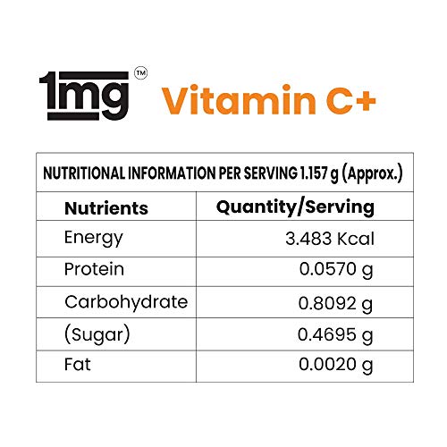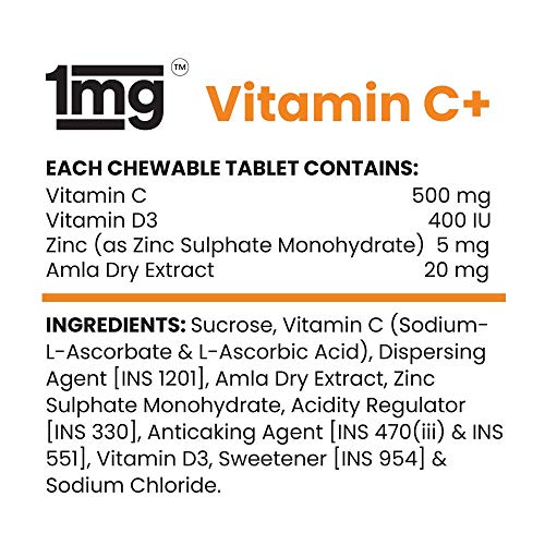 1mg Vitamin C+ Chewable Tablet provides the goodness of amla vitamin C vitamin D3 and zinc. Vitamin C has several important functions. It is known to protect cells and keep them healthy. Vitamin C also helps in wound healing and maintains healthy skin. Additionally zinc helps with metabolism function and Vitamin D3 helps in the absorption of calcium and phosphorus. All these benefits come in easy-to-consume chewable Tabs..Key Ingredients:Vitamin CVitamin D3ZincAmla ExtractKey Benefits:It helps maintain healthy skinIt boosts the immunityIt protects the body against infectionsZinc helps the immune system and metabolism functionVitamin D3 helps in the absorption of calcium and phosphorusAmla improves the immune function reduces the effects of premature ageingDirections For Use:It is recommended to take one tablet a day or as advised by the dietician or physician.Safety Information:Read the label carefully before useStore in a cool and dry place away from direct sunlightKeep out of reach of the childrenContains saccharin sodiumNot recommended for childrenNot to exceed the stated recommended daily usageIn case of accidental overdose contact a physicianThis product is not intended to diagnose treat cure or prevent any diseaseChew the tablet before swallowing