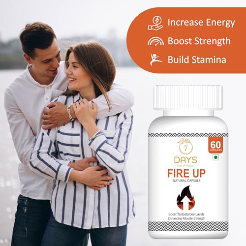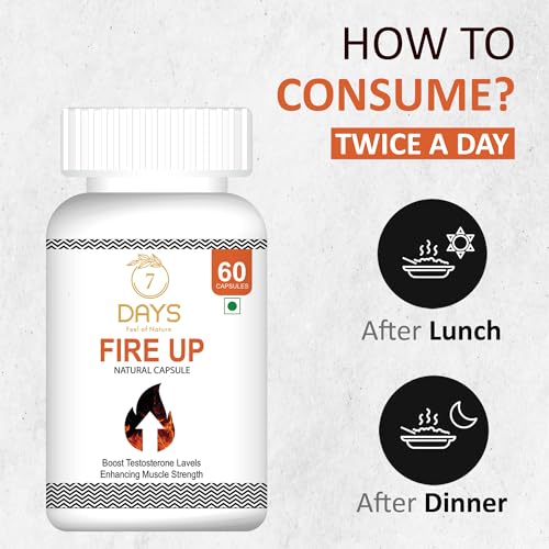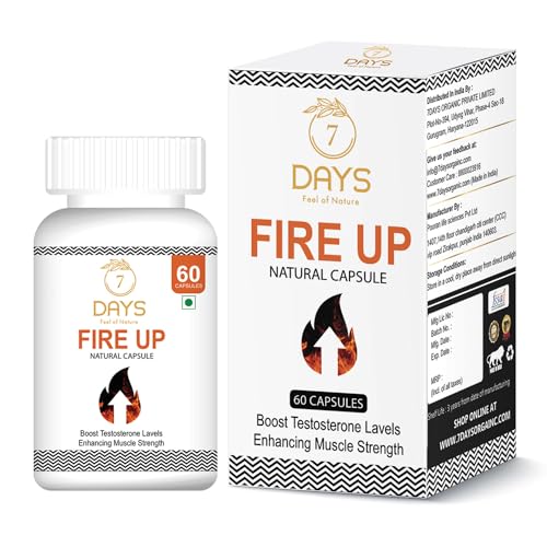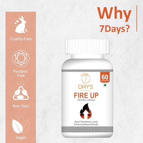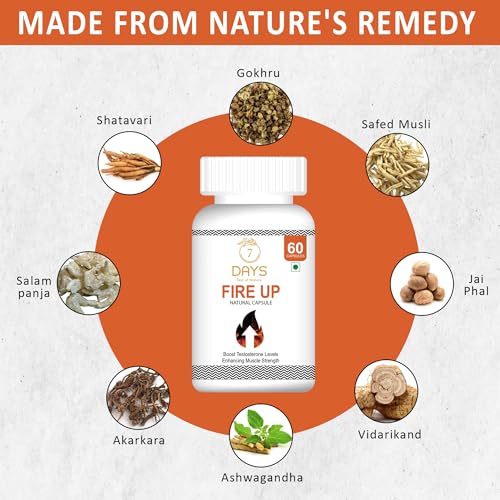 • MADE WITH NATURAL INGREDIENTS: 7 Days Fire Up Testosterone Booster Capsule is made from a blend of natural ingredients like Ashwagandha Safed Musli Gokhru Kaunchbeej and Shatavari.