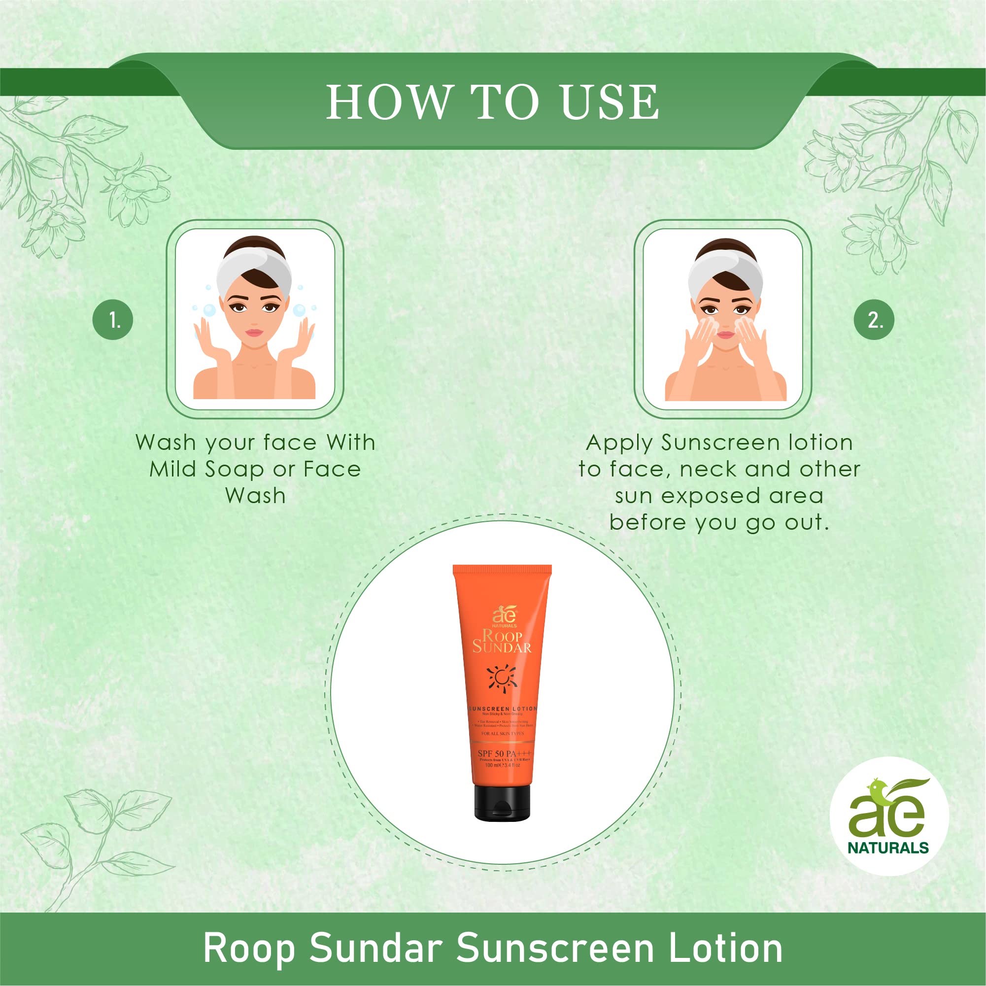 How to Use: Begin by washing your face with a mild soap or face wash. Apply Roop Sundar Sunscreen Lotion generously on your face neck and any other sun-exposed areas. Massage it well into the skin before heading out into the sun.