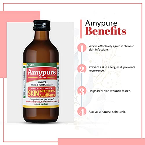 Amypure is a unique formula for inner health & outer glow acts by detoxifying impurities of blood. Aimil Amypure Syrup is an ayurvedic medicine that is primarily used for the treatment of Skin Infections Skin Allergy Pimples Burning sensation on skin. Amypure Syrup works effectively against chronic skin infections.