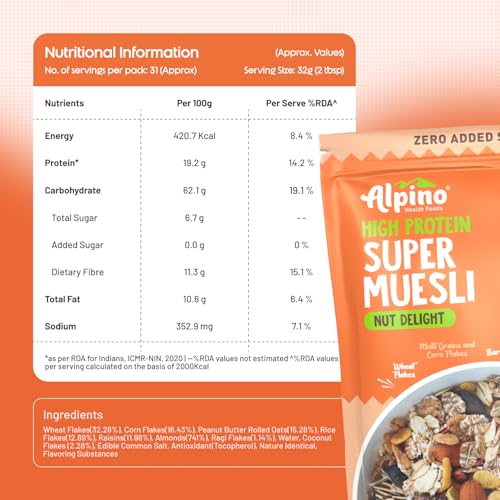 Alpino Health Foods Alpino Super Muesli Nut Delight 400 G | 20% Dried Fruits & Nuts | 69% Whole Grain Breakfast Cereal | High in Iron | Source of Fibre | Finest Nuts & Raisins | No Sugar Infused Fruits