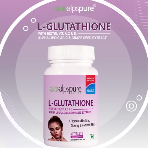 HomeHealth & PersonalDiet & NutritionHealth SupplementsAlpspure Nutra L-Glutathione Tablets with Biotin, Vitamin A.C, E, Alpha Lipoic Acid & Grape Seed Extract (30 Tablets) For Healthy and youthful Glowing Skin for Men and Women Pack of-1