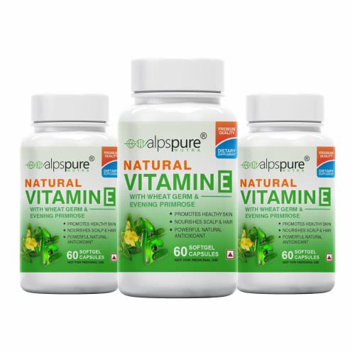 Alpspure Nutra Natural Vitamin E Softgel Capsules Natural Source for Skin, Hairs & Body care with Wheat germ oil, Immunity Booster, Controls Wrinkling & Skin Roughness Pack of-1