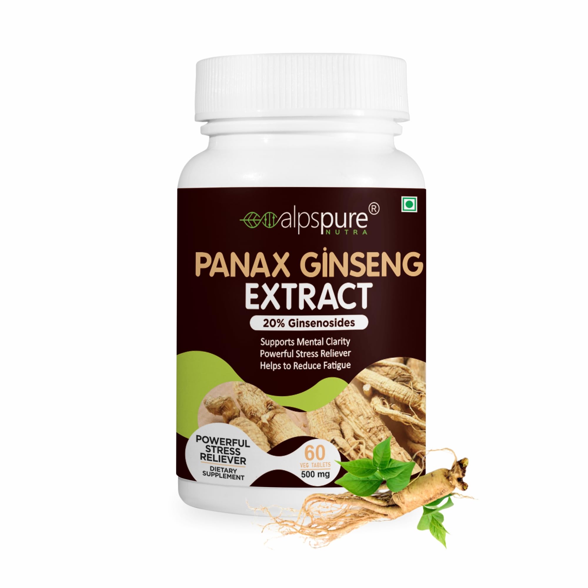 Alpspure Nutra Panax Ginseng Extract Tablets 500 mg | Korean Ginseng Extract (60 Tablets) Improves Exercise performance, Immune Function, & Stress Reliever for men and women