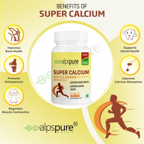 HomeHealth & PersonalDiet & NutritionHealth SupplementsAlpspure Nutra Super Calcium with Vitamin-D2, Magnesium, Zinc & Vitamin-K2-7 (60 Veg Tablets) | Bone & Joints Support Supplement | Supports Dental Health | Calcium Supplement for Men & Women