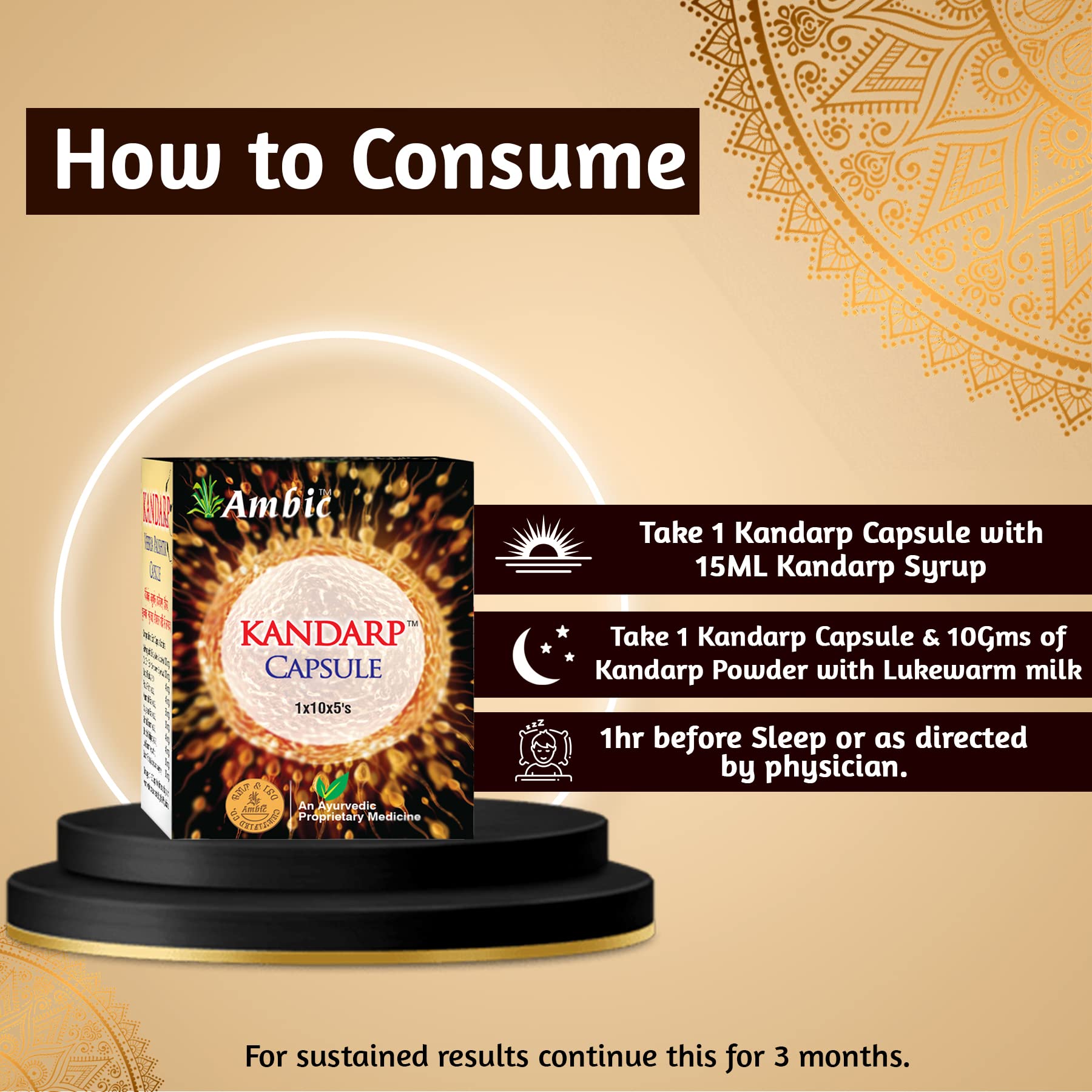 • HOW TO CONSUME: Morning - Take 1 Kandarp Capsule with Lukewarm milk. 1hr before Sleep or as directed by physician. For sustained results continue this for 3 months