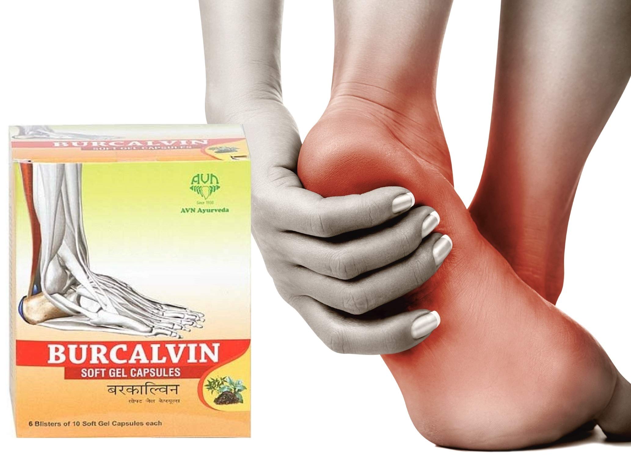 AVN Burcalvin Soft Gel Capsules. Indications: Major symptoms consist of pain in the region surrounding the spur which typically increases in intensity after prolonged periods of rest. A person may report heel pain to be more severe when waking up in the morning. A person may not be able to bear weight on the afflicted heel comfortably. Running walking or lifting heavy weight may exacerbate the issue.