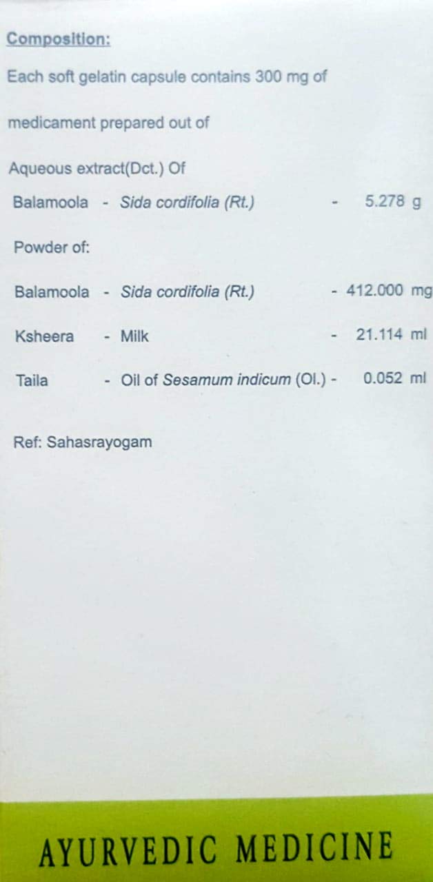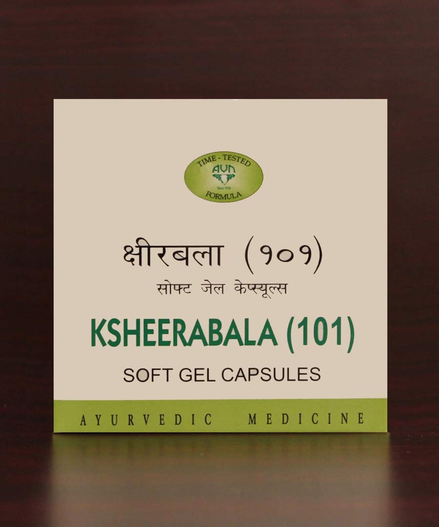 AVN Ksheerabala (101) Soft Gel Capsules. Its properties are emollient cooling strengthening anti-rheumatic nervine and analgesic. Traditionally used for arthritis numbness injuries insomnia and nervous disorders. Ksheerabala Capsules is a Nervine Tonic which can be used in many neurological disorders as well as in rheumatism and insomnia.