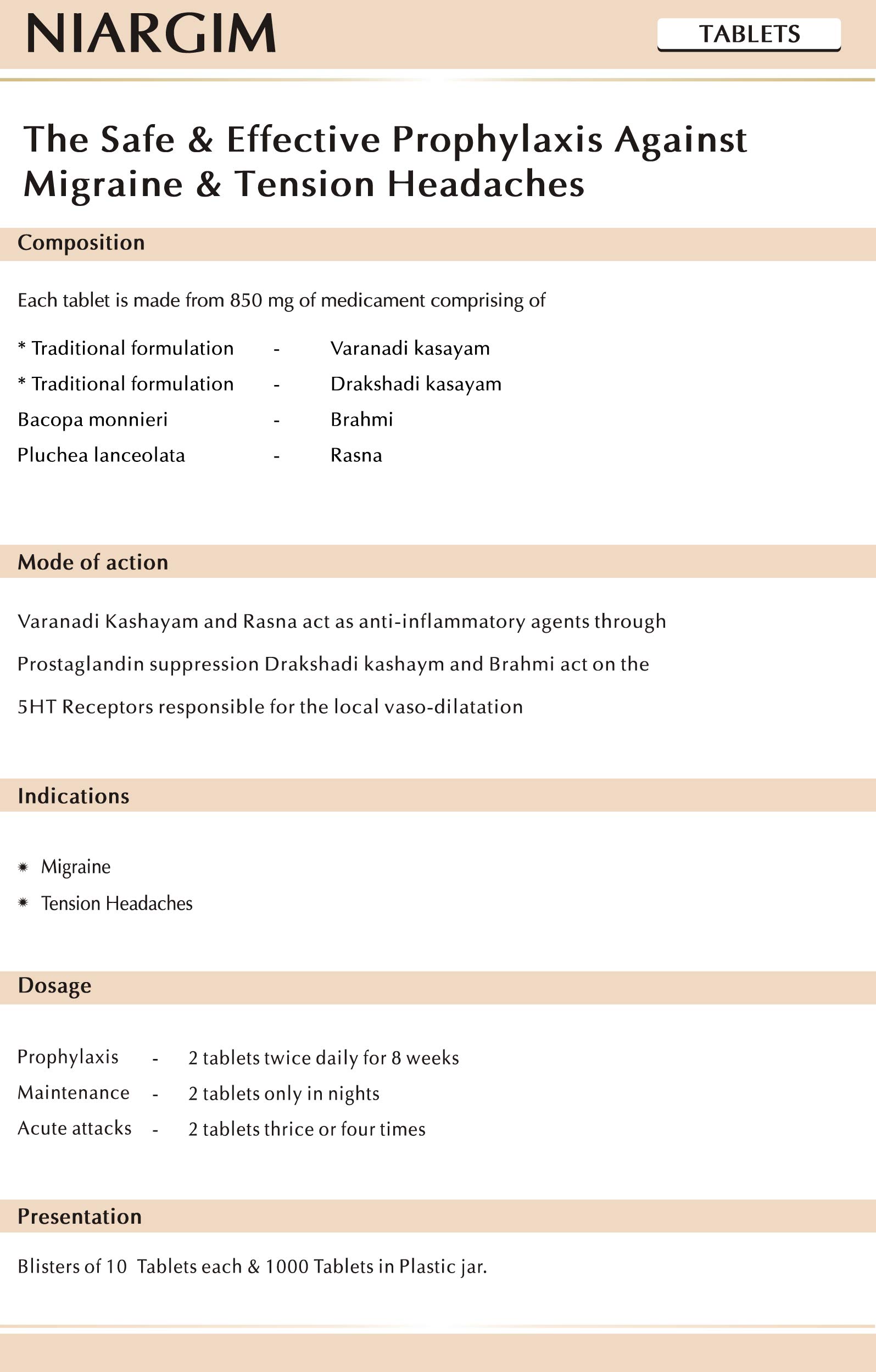 Dosage: Prophylaxis : 2 Tablets twice daily for 8 weeks; Maintenance : 2 Tablets only in nights; Acute attacks : 2 Tablets thrice or four times