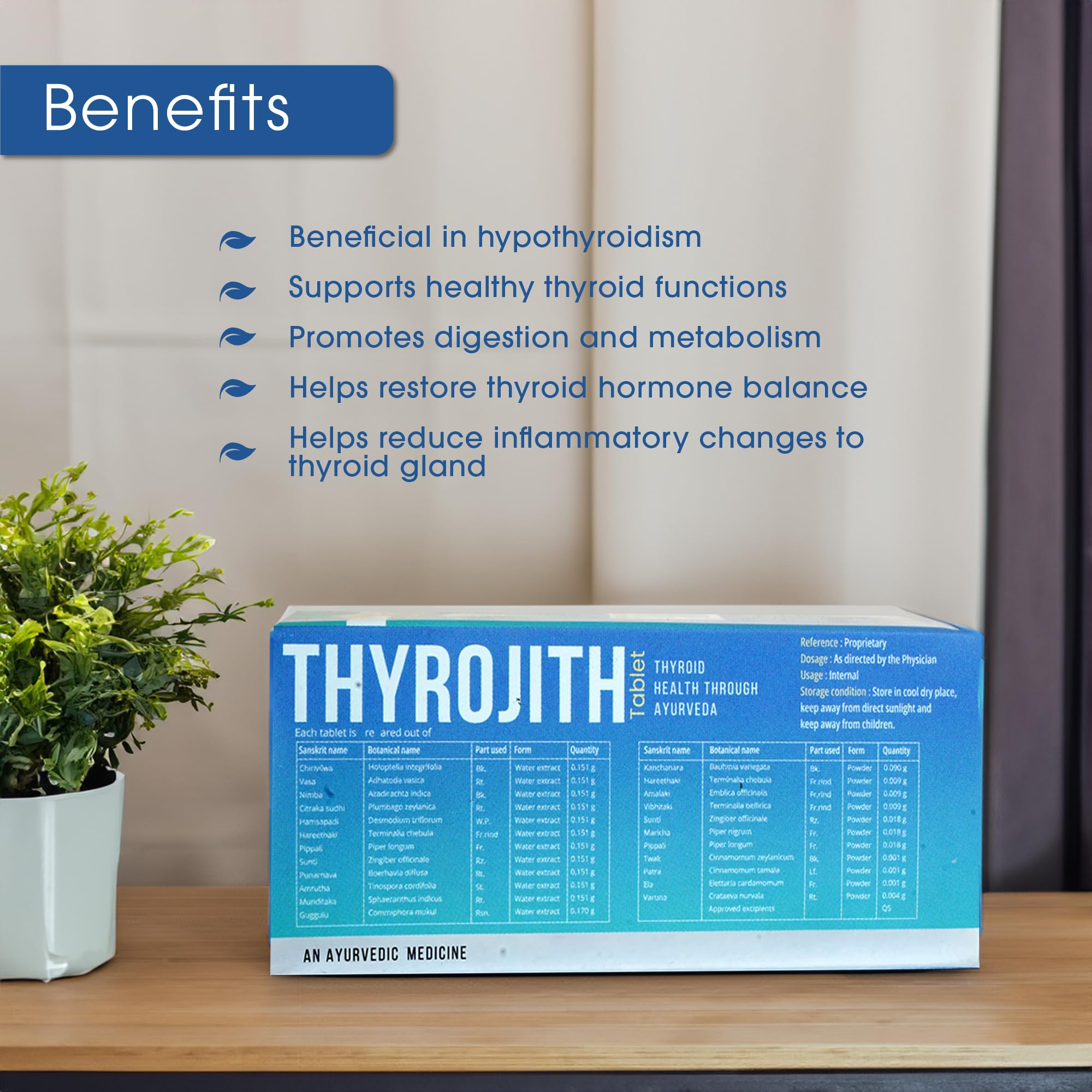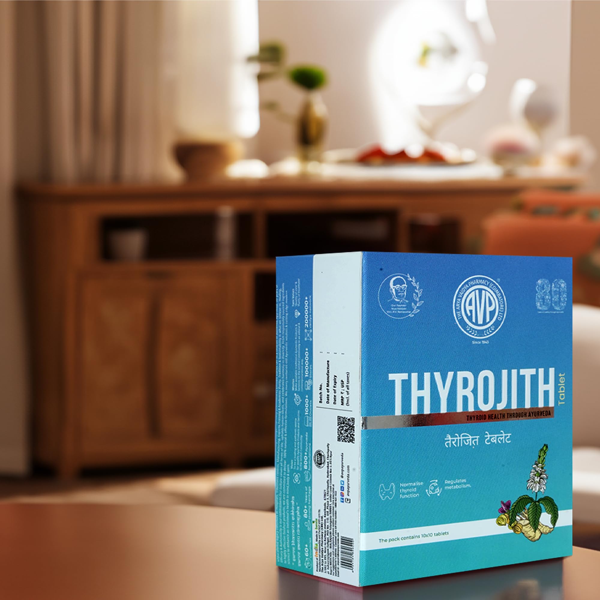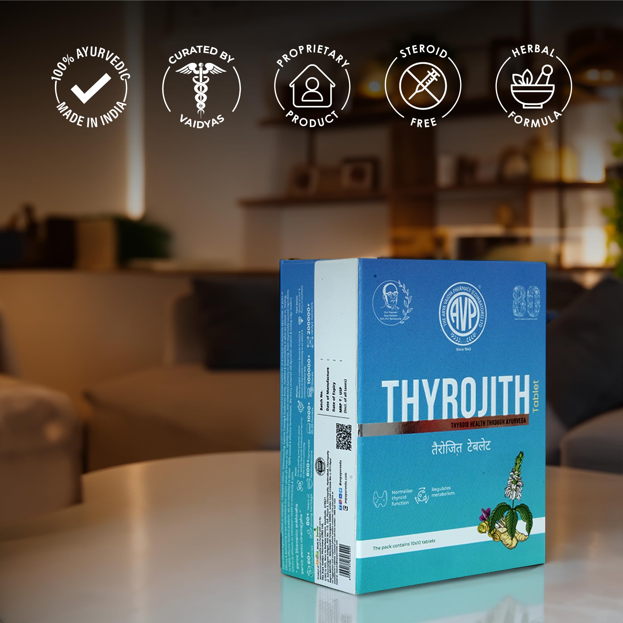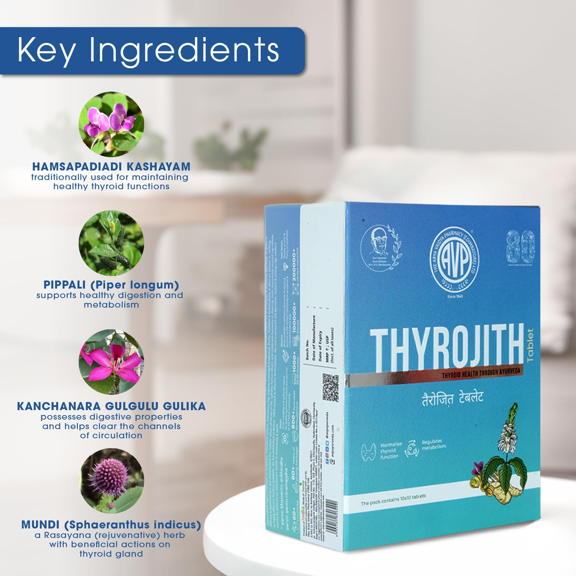 A natural support to revive thyroid functions! Thyrojith Tablets from AVP (Coimbatore) Ltd. is a combination of Hamsapadiadi kashayam and Kanchanara gulgulu gulika with other beneficial herbs to manage thyroid dysfunctions. The thyroid gland plays a pivotal role in maintaining body equilibrium. When this delicate balance falters it manifests as thyroid dysfunctions like Hypothyroidism Hyperthyroidism and likealike. These imbalances not only disrupt energy levels but also impact heart health mental clarity and emotional stability. Thyrojith Tablets from the house of AVP is a proprietary formulation curated for effective management of Thyroid dysfunction. Crafted with care and expertise each tablet is a combination of two renowned classical formulations 'Hamsapadiadi kashayam and Kanchanara gulgulu gulika'. The formulation is also potentiated with the ingredients of Chiruvilwadi Kashayam and the herb Mundi together which helps in maintaining healthy thyroid functions. While the ingredients of Hamsapadiadi Kashayam and Kanchanara gulgulu together support hormonal balance the components of Chiruvilwadi Kashayam in the Tablet promote normal digestion and metabolism. An excellent Vata Kapha balancing herb Mundi also plays its significant role in rejuvenating the gland and optimising its functions.