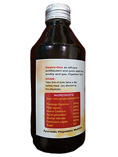 An efficient antiflatulent and quick fron acidity and Tonic. DOSE: Take 5ml of tonic twice a day before meal (or) directed by the physician. INGREDIENTS: Each 10ml contains extracts from Plumbago Zeylanica : 300mg Piper nigrum : 300mg Acorus Calamnus : 300mg Apium graveolens : 600mg Zinziber officinale : 300mg Foeniculum vulgare : 600mg Sugar : Q.S