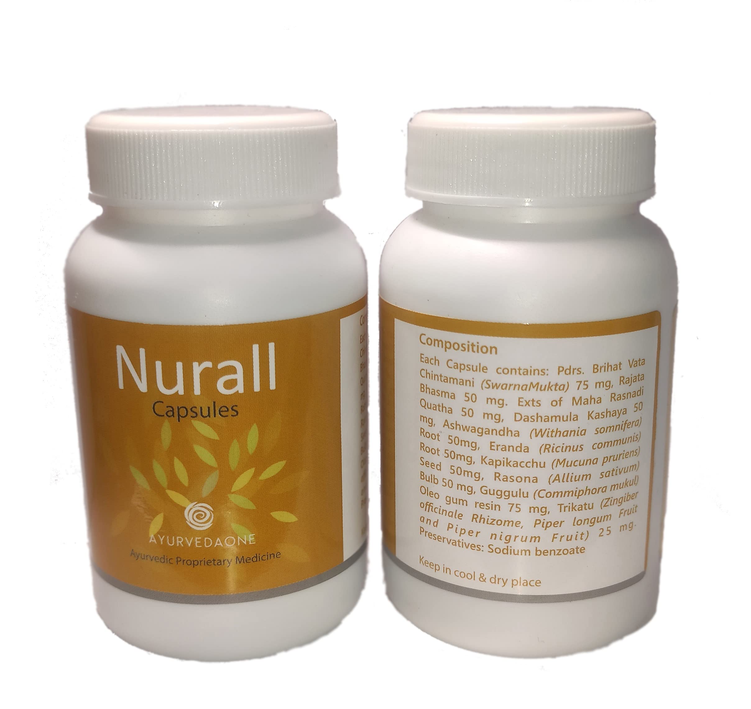 AyurvedaOne Nurall Ayurvedic Capsules - 60 Capsules Nurall is an Ayurdevic Herbal Capsules Neuropathic pain This pack contains 60 Tablets. Nurall is an Ayurdevic Herbal Capsule It is used for Neuropathic Pain Nurall is one of the best Ayurvedic Capsule for Neuropathic
