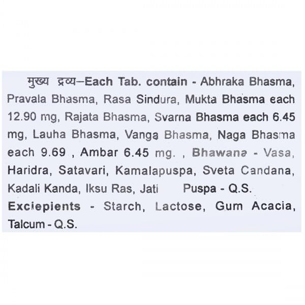 General Benefits Baidyanath Basantkusmakar Ras (S.C.M.Yu) is an ayurvedic medicine that contains Gold Silver & Pearl. It helps in maintaining good blood glucose level contolling Sugar and treating debility of heart and brain. It is also very effective in urinary infections Men's debility phthisis asthma and general weakness. It can also be used to treat general weakness Men's debility and urinary infections. Therapeutic Uses Acts as an alterative stimulant & tonic. Indicated in Sugar mellitus Sugar-insipidus urinary affections Men's debility phthisi asthma leucorrhoea diuresis & general debility. Also used as a tonic for heart & brain. Ingredients Prawal Bhasma Chandrodaya or Ras Sindoor Moti Pishti Abhrak Bhasma Raupya Bhasma Suvarna Bhasma Shatavari Adulasa Swaras Ganna Kamal Ke Phool Mahuti Ke Phool Kadali Kanda Malati Phool Chandan Kasturi. Dosage 1 Tab. with water twice a day or as directed by Physician. Ayurvedic Reference Sidh Yog Samgrah Detailed Description Baidyanath (Jhansi) Basant Kusumakar Ras with Gold Tablet is an excellent Ayurvedic remedy for the management of high blood sugar levels and diabetes. This product has properties that are effective in protecting the body from various problems such as polyuria caused due to diabetes. It protects and nourishes the body and helps build strength. Key Ingredients: Prawal Pisti Ras Sindoor Sudh Parad Sudh Gandhak Ras Karpur Sudh Sankhaiya Moti Pisti Abhrak Bhasm Chandi Bhasm Swarn Bhasm Lauh Bhasm Nag Bhasm Good to Know: Basant Kusumakar Ras with Gold Tablet is formulated with a blend of potent Ayurvedic ingredients known for their therapeutic properties in managing diabetes and related complications. Ideal For: Suitable for individuals diagnosed with diabetes and experiencing symptoms such as polyuria weakness and related complications. Key Benefits: Provides effective protection from the belittling effects of diabetes Keeps the body strong and prevents weakness Helpful in urinary problems produced due to diabetes such as polyuria Directions For Use: 1-2 tablets (125-250 mg) twice daily with honey or milk or as directed by an Ayurvedic practitioner Safety Information: Store the formulation in cool and dry place Read the label carefully before use Description: Vasant Kusumakar Ras or Basant Kusumakar Ras is comination of herbs mineral and metallic or Ras Aushadhi of Ayurveda. It is a Rasayan or tonic.The name of this medicine signifies as the spring (Vasant) causes blossom (Kusum) in the plant similarly intake of this medicine may give strength to your body. It may also be useful for good complexion and may gives glow to skin. It is beneficial in High Blood Sugar level and for early ageing process. Vasant Kusumakar Ras is especially useful in many reproductive disorders of both male and female.