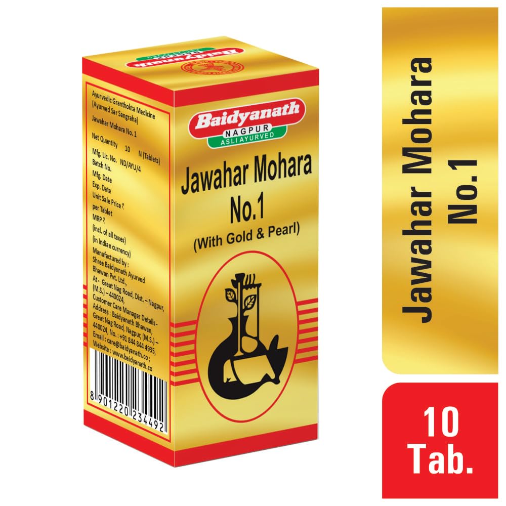 Baidyanath Jawahar Mohra No.1 SMAY Tablets are a traditional Ayurvedic herbal supplement designed to support heart and brain health. This formulation is made using a unique blend of Ayurvedic ingredients such as Praval Pishti Manikya Pishti and Mukta Pishti which are known for their beneficial properties in supporting overall wellness.Jawahar Mohra No.1 SMAY is traditionally used to help maintain the health of the heart and nervous system. It provides nourishment that supports overall balance and well-being.As with all Ayurvedic supplements it is recommended to use Baidyanath Jawahar Mohra No.1 SMAY under the guidance of a healthcare professional to ensure it meets your specific needs.