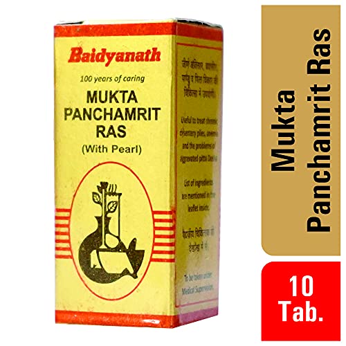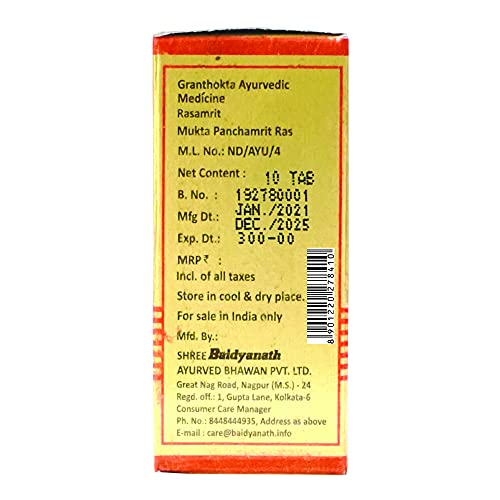 Baidyanath Muktapanchamrit Ras My -10 Tablets. One of Indiaâs most respected Companies Shree Baidyanath Ayurved Bhawan Pvt. Ltd. (Kolkata) popularly known as Baidyanath is the acknowledged leader of Ayurvedic know-how. Established in 1917 the Company has played a pioneering role in re-establishing ancient knowledge with modern research and manufacturing techniques. AYURVEDA is a 5000 year old Science of health care and herbal treatment. AYURVEDA is highly effective in common and complicated ailments assures long term relief and has no side effects. AYURVEDA is now backed by modern scientific research and technologies and provides its gentle healing touch to millions around the world.