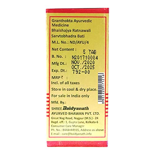 Baidyanath Sarvtobhadra Bati (With Gold & Roupya) Kidney Health Support - 5 Tablets. One of Indiaâs most respected Companies Shree Baidyanath Ayurved Bhawan Pvt. Ltd. (Kolkata) popularly known as Baidyanath is the acknowledged leader of Ayurvedic know-how. Established in 1917 the Company has played a pioneering role in re-establishing ancient knowledge with modern research and manufacturing techniques. AYURVEDA is a 5000 year old Science of health care and herbal treatment. AYURVEDA is highly effective in common and complicated ailments assures long term relief and has no side effects. AYURVEDA is now backed by modern scientific research and technologies and provides its gentle healing touch to millions around the world.