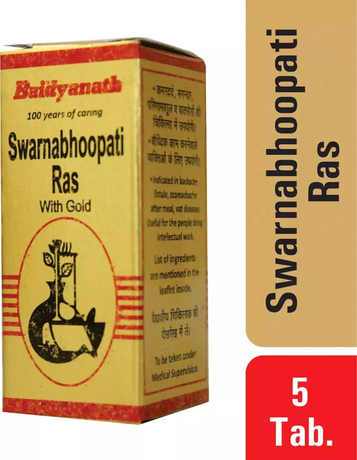 Baidyanath Swarnabhoopati Ras Sy-5 Tab. One of India;s most respected Companies Shree Baidyanath Ayurved Bhawan Pvt. Ltd. (Nagpur) popularly known as Baidyanath is the acknowledged leader of Ayurvedic know-how. Established in 1917 the Company has played a pioneering role in re-establishing ancient knowledge with modern research and manufacturing techniques. AYURVEDA is a 5000 year old Science of health care and herbal treatment. AYURVEDA is highly effective in common and complicated ailments assures long term relief and has no side effects. AYURVEDA is now backed by modern scientific research and technologies and provides its gentle healing touch to millions around the world.