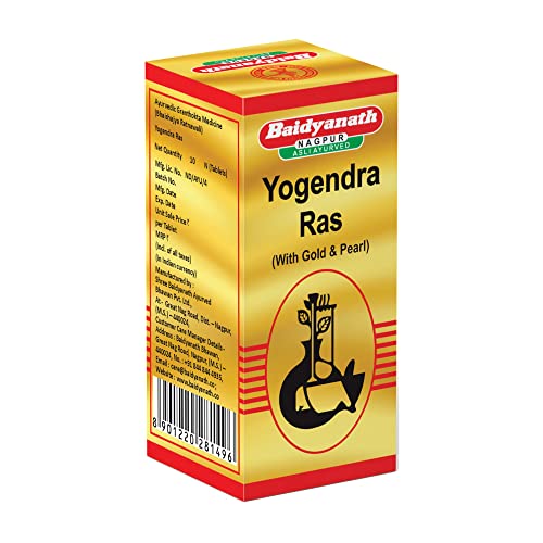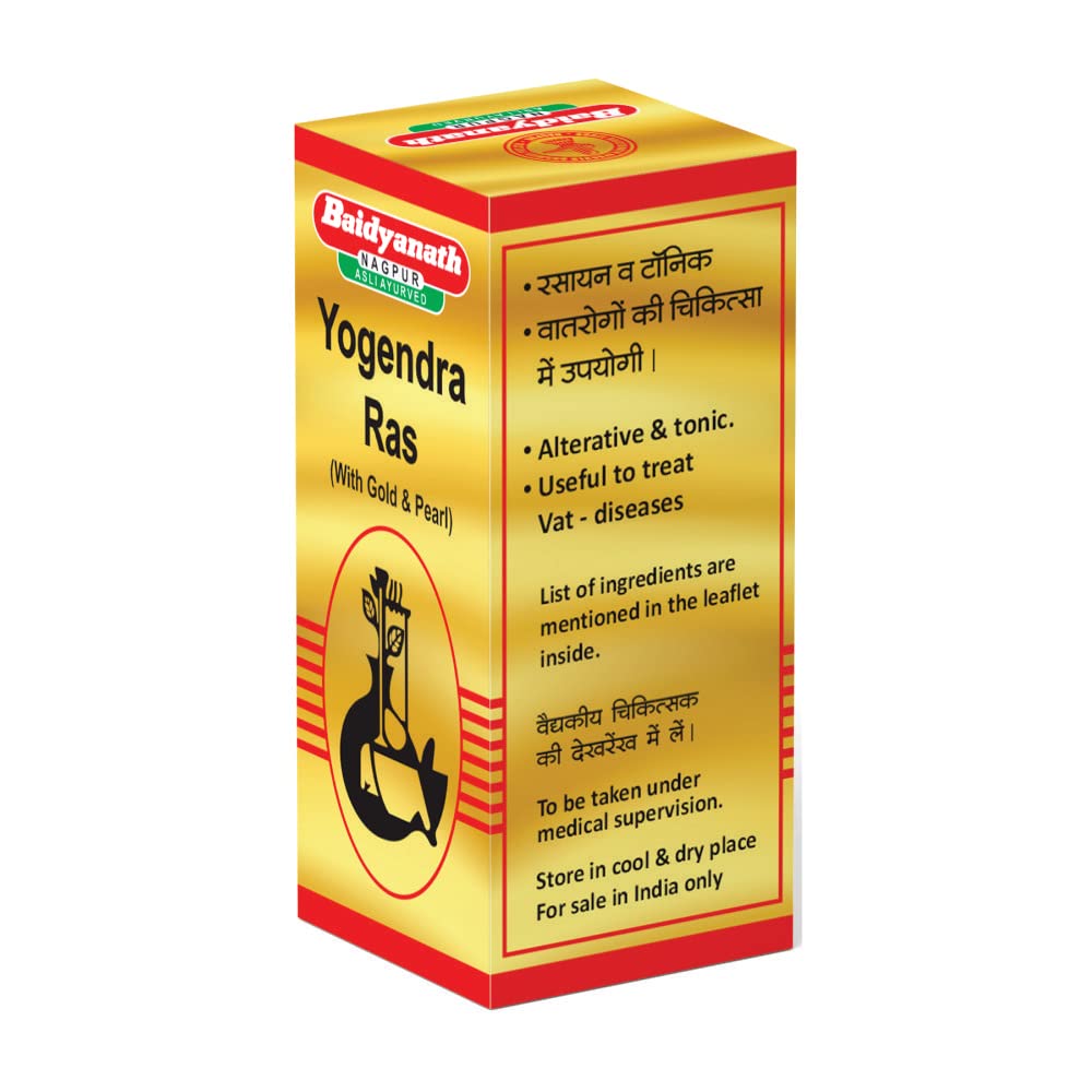 Yogendra Ras is enriched with pure gold and pearl having nutritive alterative cardiotonic and stimulant activity. Yogendra Ras is also used in the treatment of neuro-muscular conditions. It has natural herbs pure minerals and metals that can treat a number of pitta disorders.