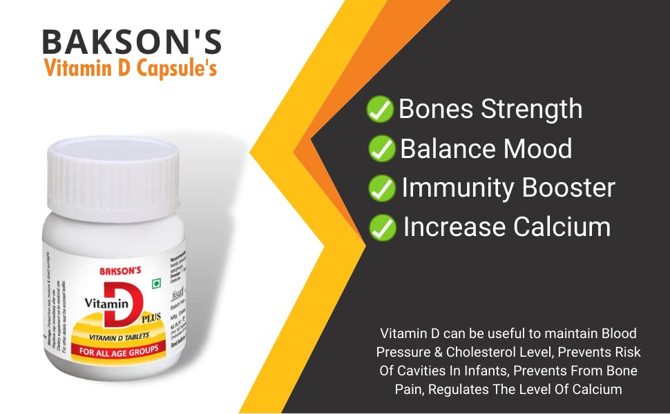 Bakson's Vitamin D Plus Promotes Calcium Absorption Bone Health Muscle Strength & Boosts Immunity | Comes With Vitamin ABC & E for All Age Groups - (30 tab)