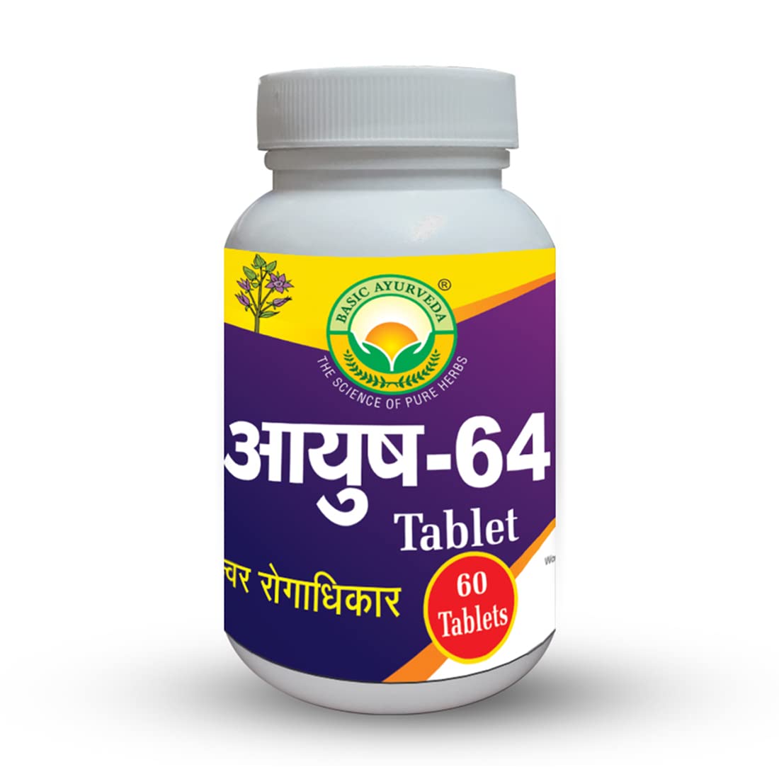 • Basic Ayurveda Ayush 64 tablet with a combination of ingredients: Saptaparna stem Katuki Root Chirayata Whole Plant Kuberaksha and other prominent herbs.