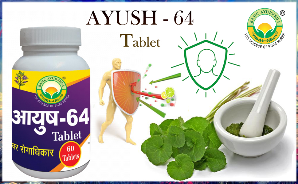 • Basic Ayurveda Ayush-64 tablets is an ayurvedic unique formulation that is used to boost immunity fight infections common cold & cough throat irritation and improve respiratory functions. It is used to strengthen the immune system.