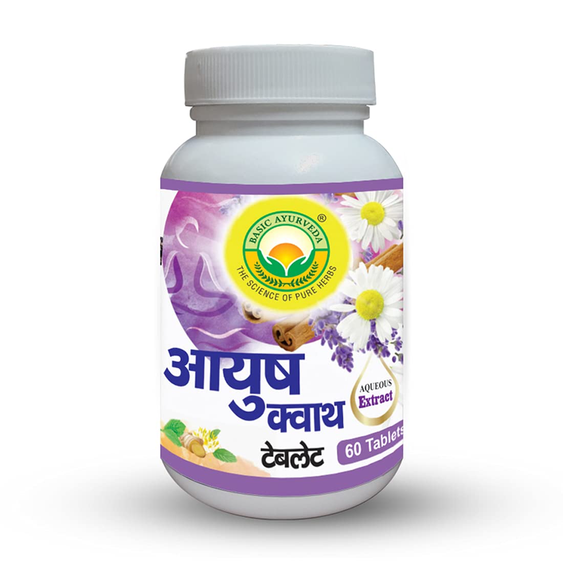 • Basic Ayurveda Ayush Kwath tablet is an ayurvedic unique formulation that is used to boost immunity fight infections common cold & cough throat irritation and improve respiratory functions. It is used to strengthen the immune system.
