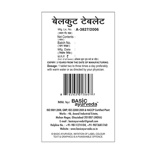• Basic Ayurveda Belkut Tablet is a naturally formulated ayurvedic mixture available in the form of a tablet. It is increases the Pitta and therefore helps to support and maintain the digestive health and and constipation of the human body.