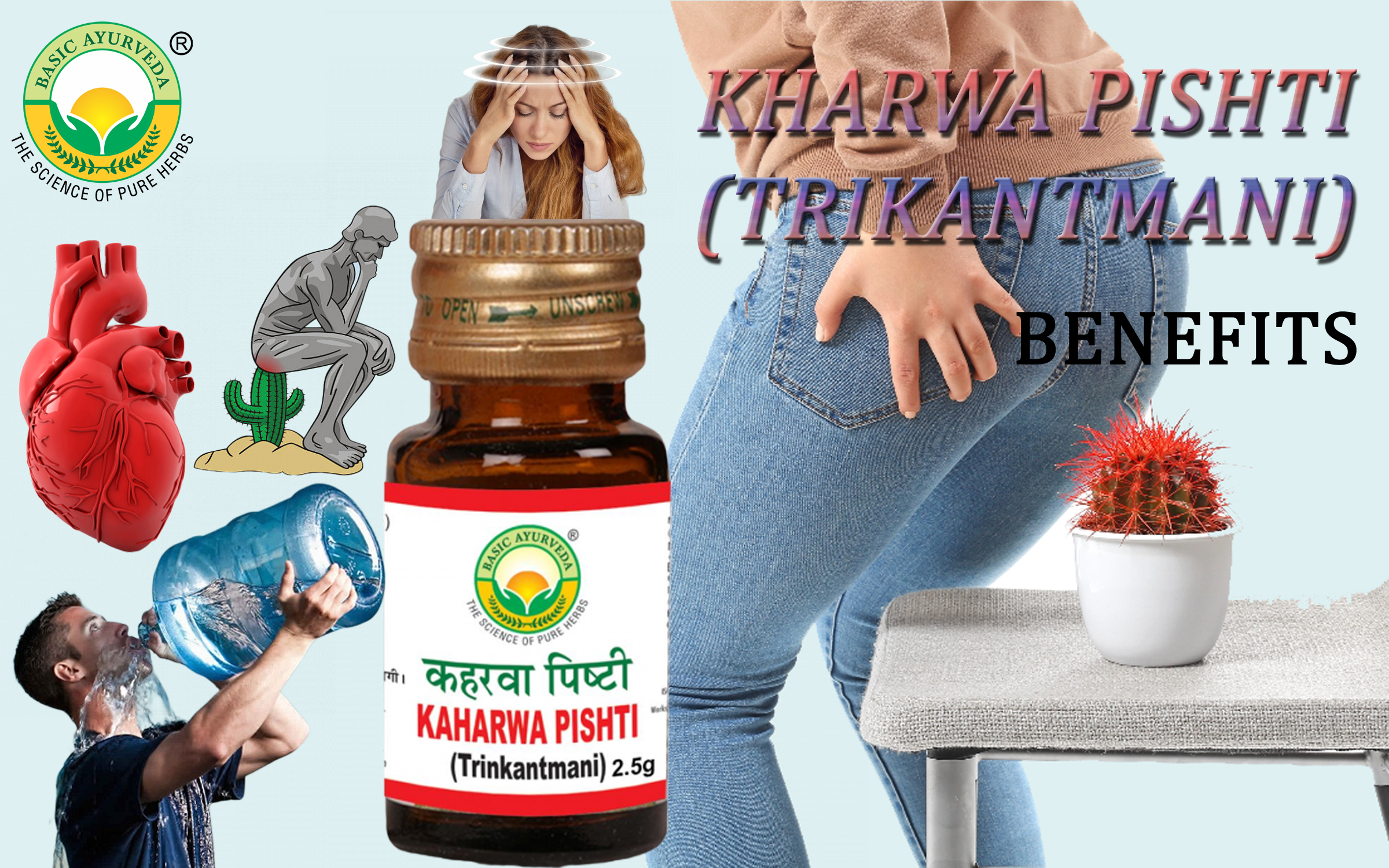 • Kaharwa Pishti also spelled as (Kaharva Pishti Keharwa Pishti Trinkant Mani Pishti) helps with heat problems loose motion swelling of the stomach cuts and female blood-related problems.