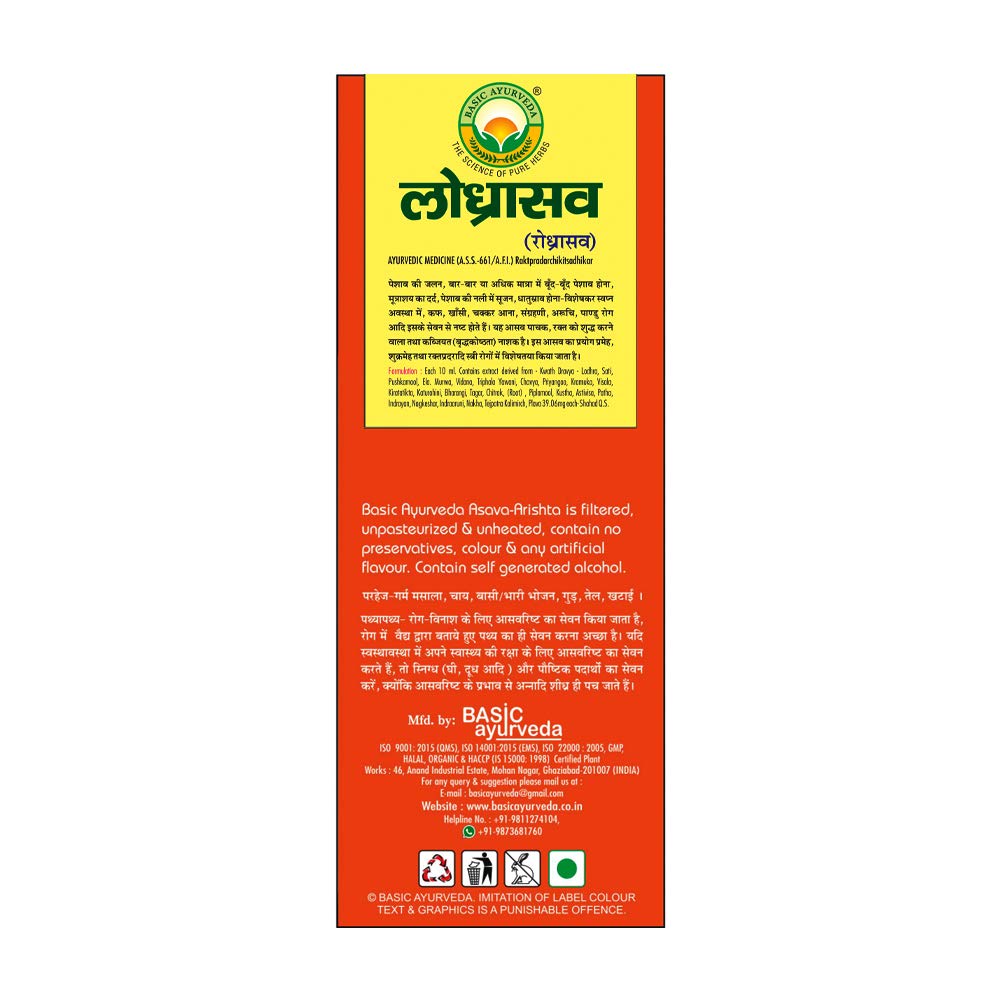 • Basic Ayurveda's Lodhrasava (syrup) health Benefits: Ayurvedic Herb Urine problems Pain in Urinary Cold & Cough Anemia Useful in Constipation weight management Improve Digestion All skin problems Woman Health Problem