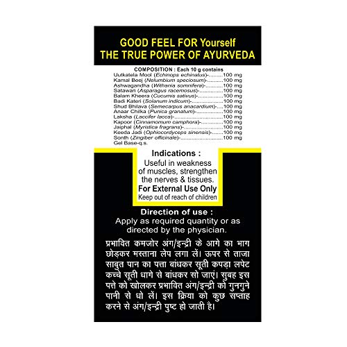 Basic Ayurveda Mastana Lep with a combination of ingredients: Uutkatela Mool Kamal beej Ashwagandha Shatavari Balam Kheera Badi Kateri Shud Bhilava Annar Chilka Laksha Kapoor Jaiphal Keeda Jadi Sonth.