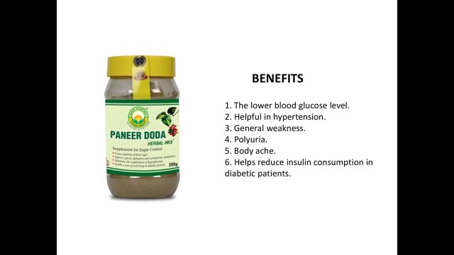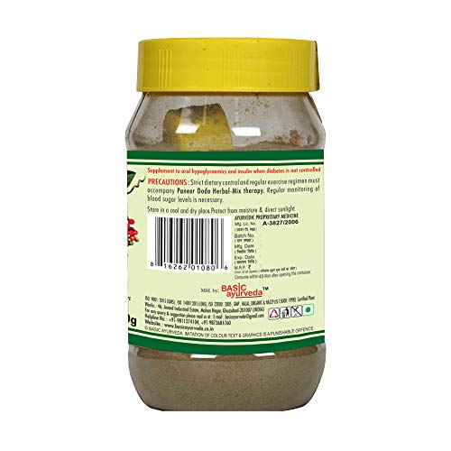 • Paneer Doda Herbal mix powder contains a potent combination of the herbs Gurmar leaf Shpta Rangi steam Jamun seed Guduchi stem Bael leaf Tulsi leaf Methi seed Karela fruit Bhawana Dravya Paneer Doda.