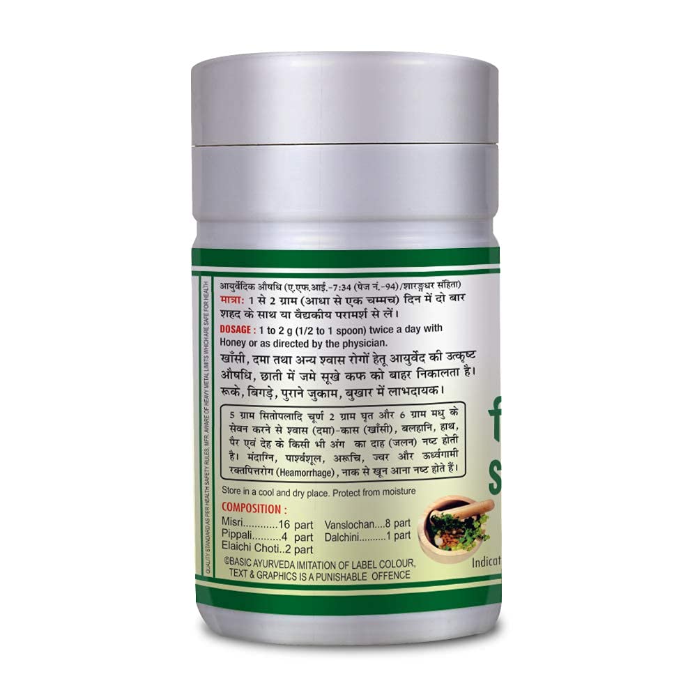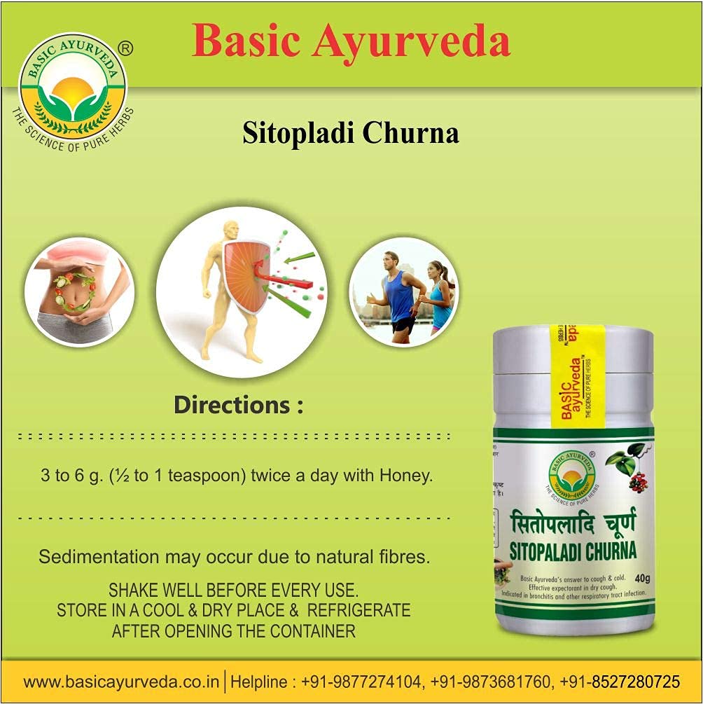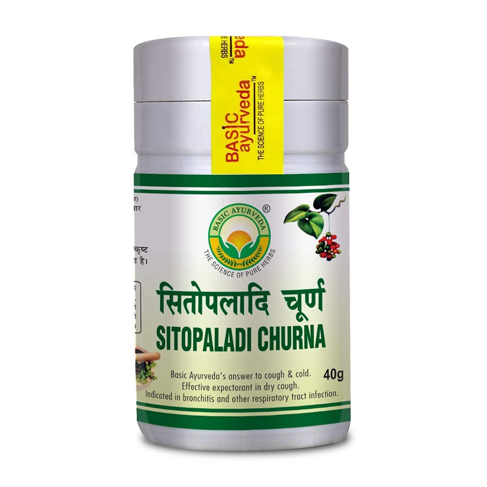 • Basic Ayurveda Sitopaladi Churna is an Ayurvedic herbal formulation that is used in the management of seasonal colds and coughs. It shows anti-inflammatory and expectorant properties which helps in managing respiratory problems.