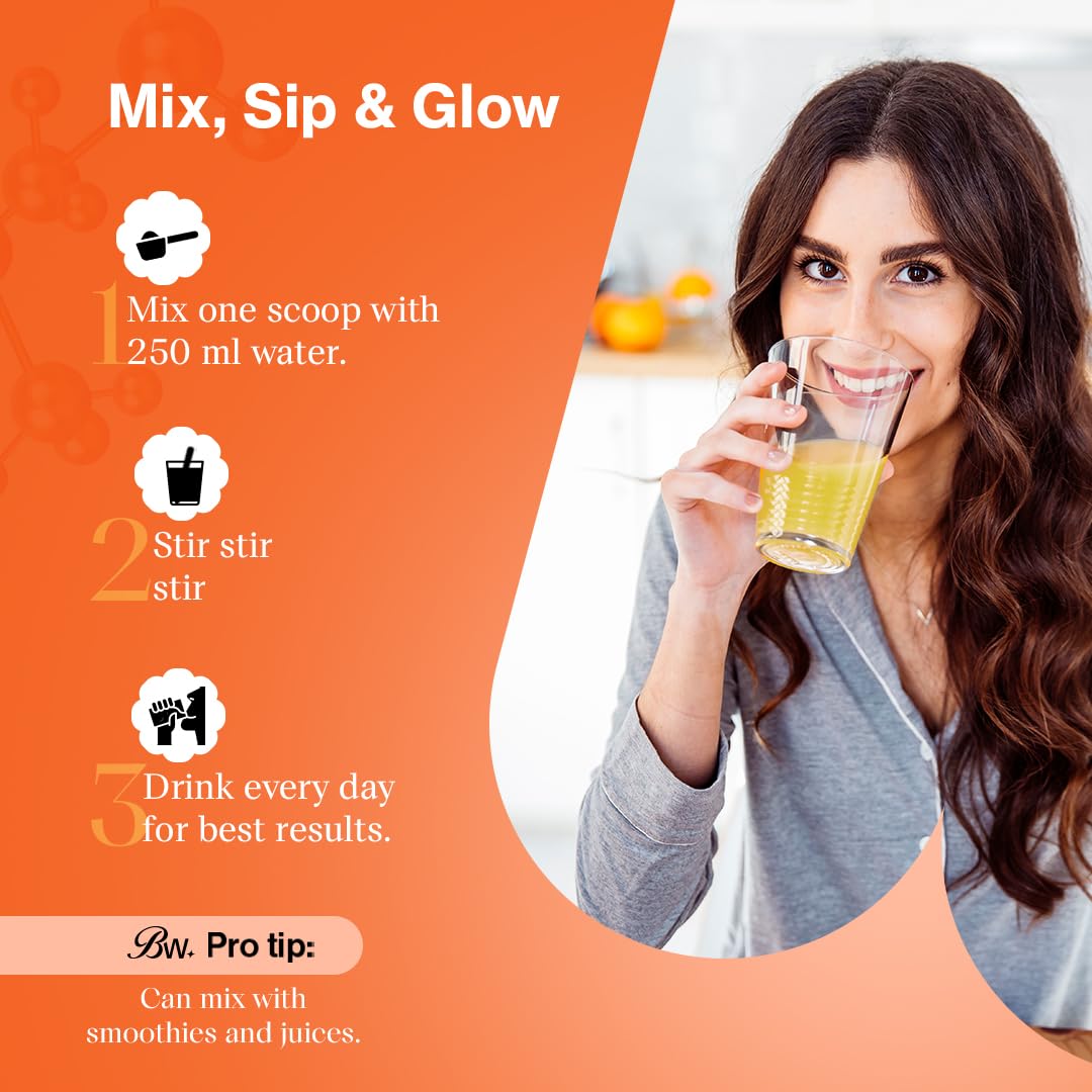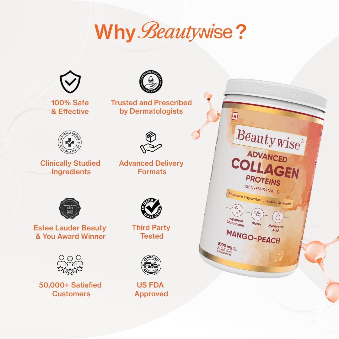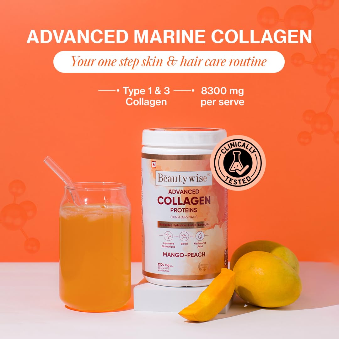 Beautywise Advanced Marine Collagen Proteins Powder With Hyaluronic Acid Glutathione & Biotin | No Smell & Easy To Mix With No Added Sugar 250G(Mango-Peach Pack Of 1)