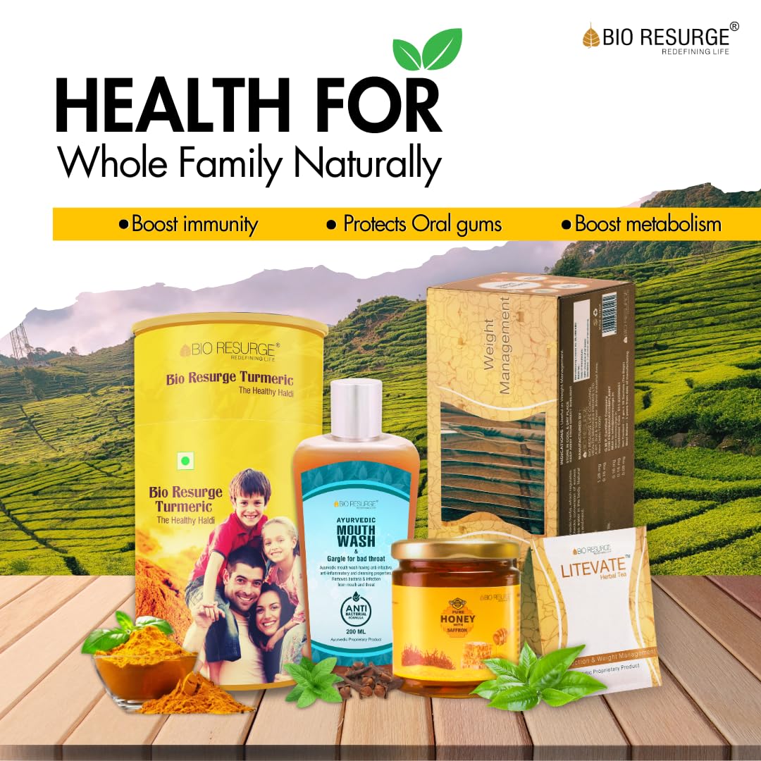 Embrace a holistic lifestyle with this comprehensive wellness package. The Bio Resurge Turmeric powder derived from the potent golden spice promotes overall health and well-being with its anti-inflammatory properties. Complement it with the Ayurvedic Mouth Wash a soothing herbal gargle that soothes sore throats and maintains oral hygiene. Indulge in the natural sweetness of the Saffron Honey a delectable addition to your daily routine. The W********s Management kit offers a comprehensive approach to healthy living while the Litevate supplement supports digestive health. This curated collection combines traditional wisdom with modern science empowering you to nourish your body mind and spirit harmoniously.