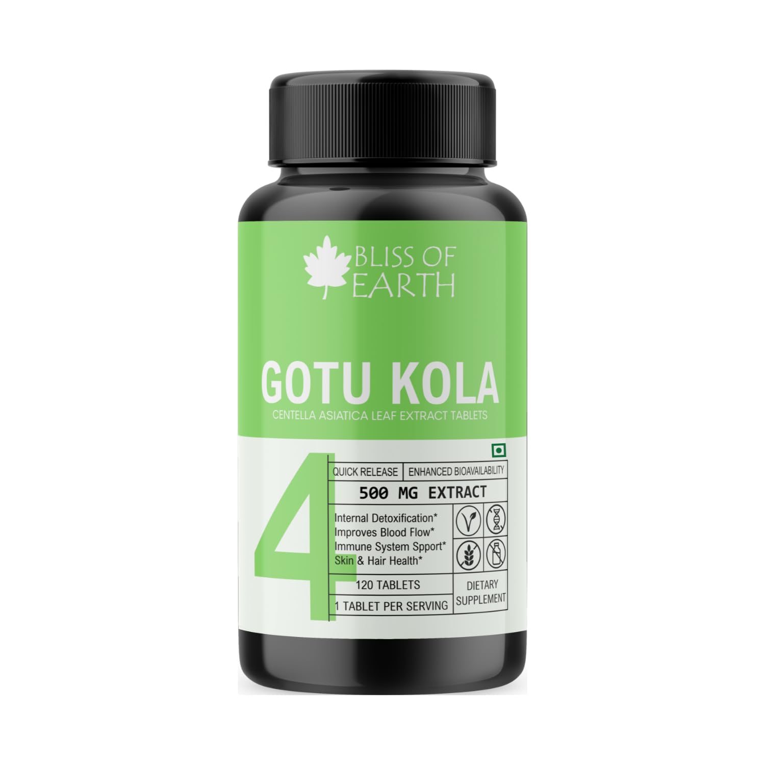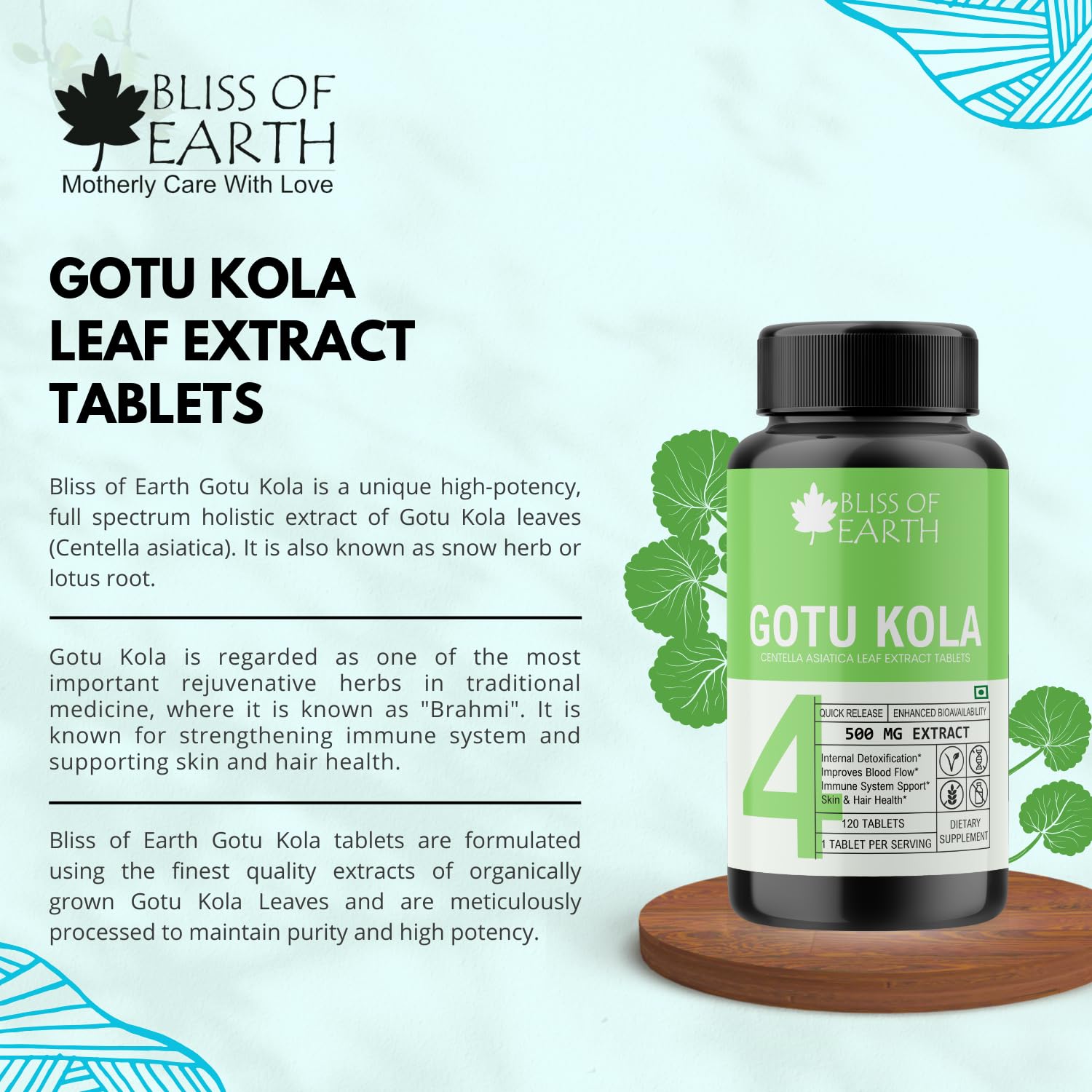 HIGH POTANCY GOTU KOLA LEAVES EXTRACT: Bliss of Earth Gotu Kola Tablets are formulated using the extract of superior-grade Gotu Kola leaves that passes through stringent potency and purity tests.