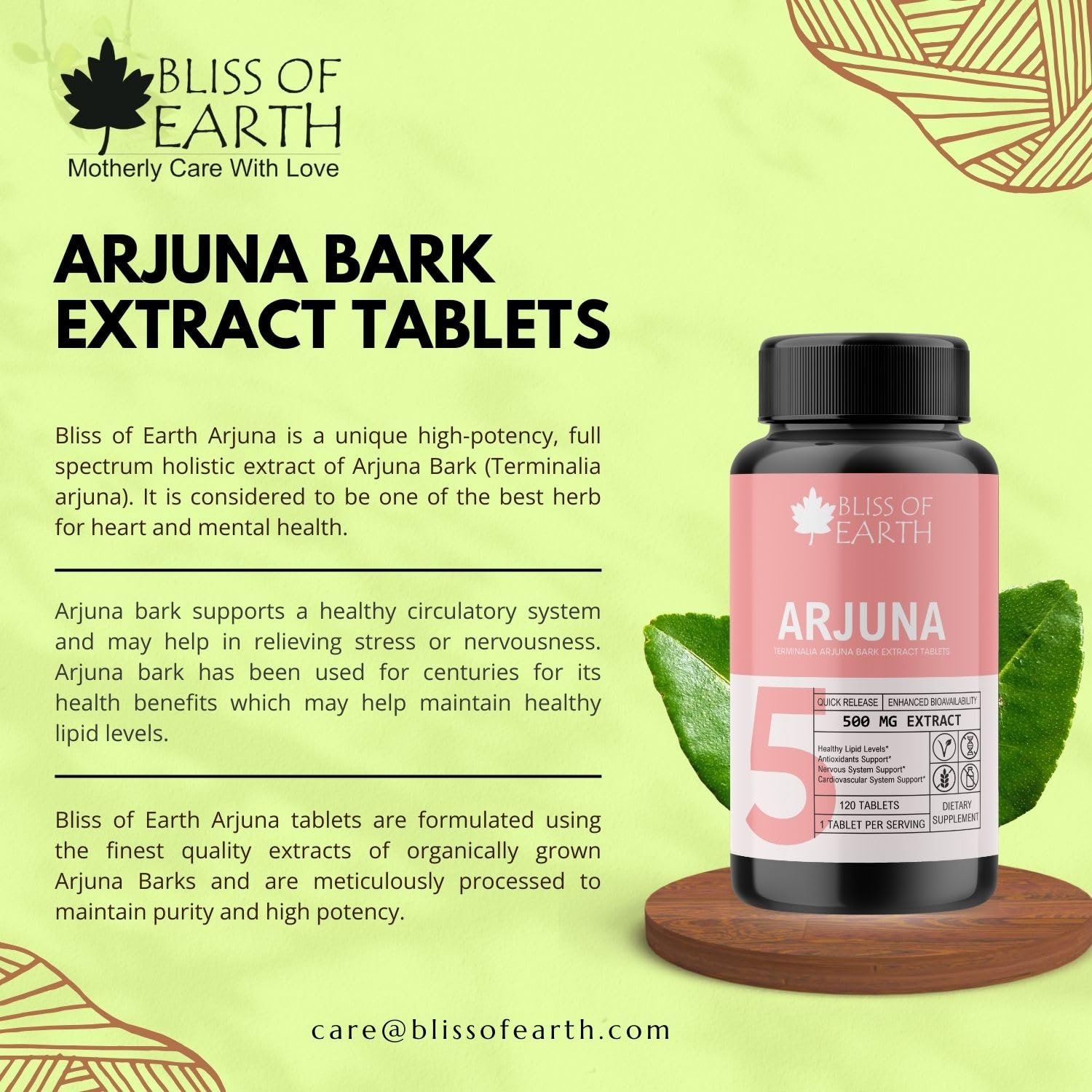 • HIGH POTANCY ARJUNA BARK EXTRACT: Bliss of Earth Terminalia Arjuna Tablets are formulated using the extract of superior-grade Arjuna Bark that passes through stringent potency and purity tests.
