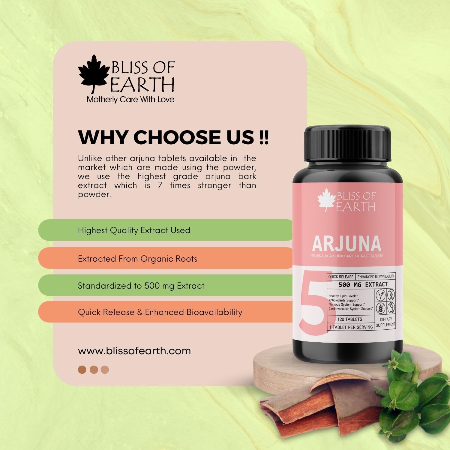 • HIGH POTANCY ARJUNA BARK EXTRACT: Bliss of Earth Terminalia Arjuna Tablets are formulated using the extract of superior-grade Arjuna Bark that passes through stringent potency and purity tests.