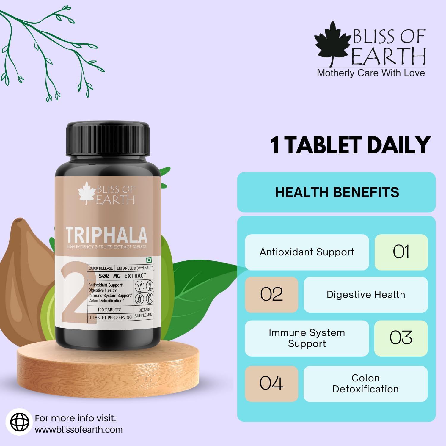 Discover the time-honored secret of Triphala with Bliss of Earth Triphala Extract Tablets. Triphala a blend of three powerful Ayurvedic fruits - Amla (Indian Gooseberry) Haritaki (Terminalia chebula) and Bibhitaki (Terminalia bellirica) has been cherished for centuries for its digestive health benefits. These 500mg tablets offer a convenient and effective way to support your digestive system and alleviate constipation.