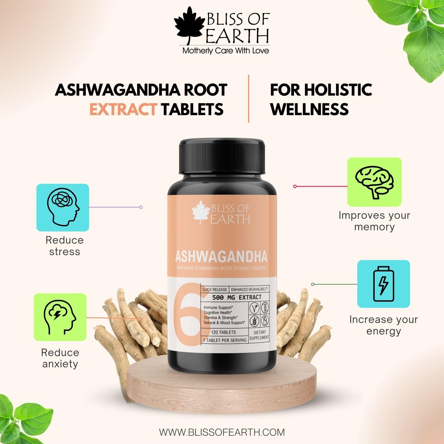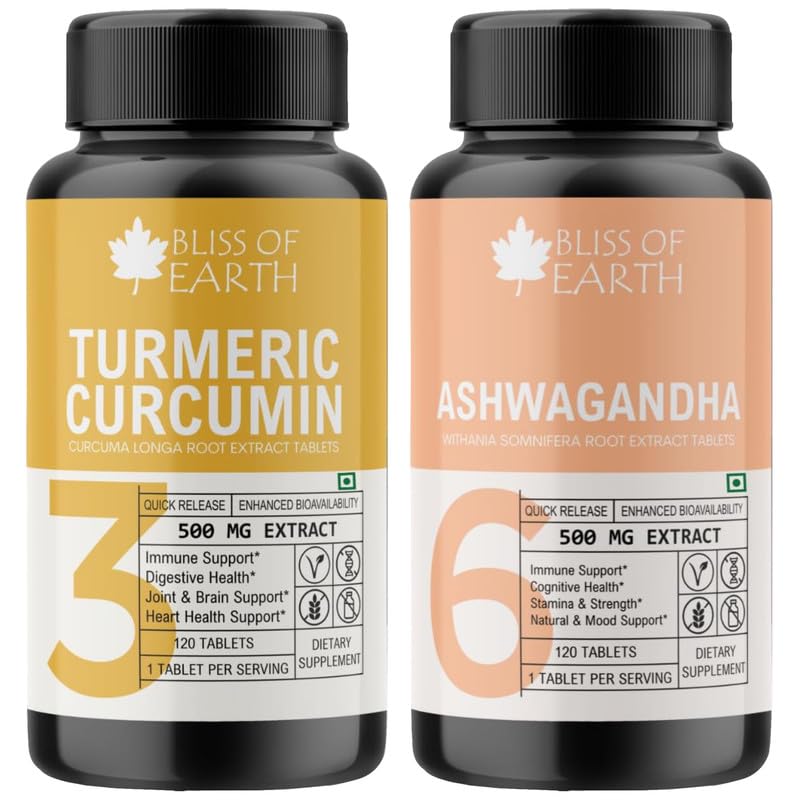 Unlock the power of nature with Bliss of Earth Turmeric Curcumin 500mg tablets a natural supplement designed to promote joint health and support a healthy inflammatory response. These tablets feature a potent dose of curcumin the active compound found in turmeric renowned for its potential health benefits. Experience the quick release and enhanced bioavailability for maximum effectiveness. & Bliss of Earth Ashwagandha scientifically known as Withania somnifera is a renowned adaptogenic herb with a long history of use in traditional Ayurvedic medicine. These Ashwagandha tablets offer a convenient and standardized way to incorporate the numerous potential health benefits of this herbal remedy into your daily routine.