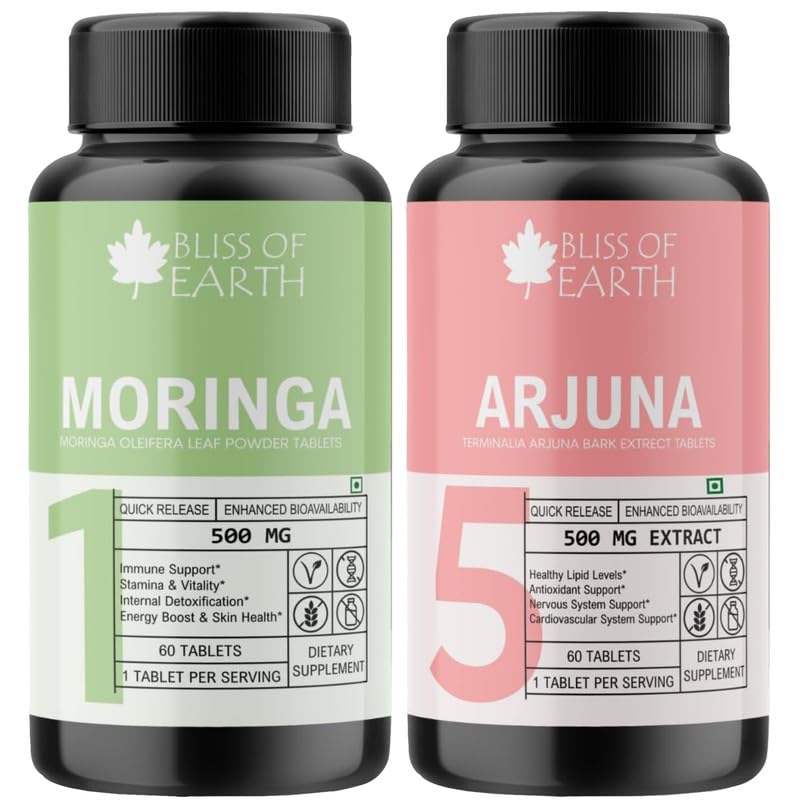Experience the natural goodness of Moringa Oleifera with Bliss of Earth Moringa Tablets. Moringa often referred to as the "Miracle Tree" or "Drumstick Tree" has been cherished for centuries for its exceptional nutritional value and numerous health benefits. These 500mg Moringa tablets offer a convenient and potent way to enrich your daily wellness routine. & Bliss of Earth Arjuna scientifically known as Terminalia arjuna is a revered herbal supplement celebrated for its potential cardiovascular benefits. These Arjuna tablets offer a convenient and standardized way to incorporate the natural goodness of this traditional Ayurvedic herb into your daily wellness regimen.
