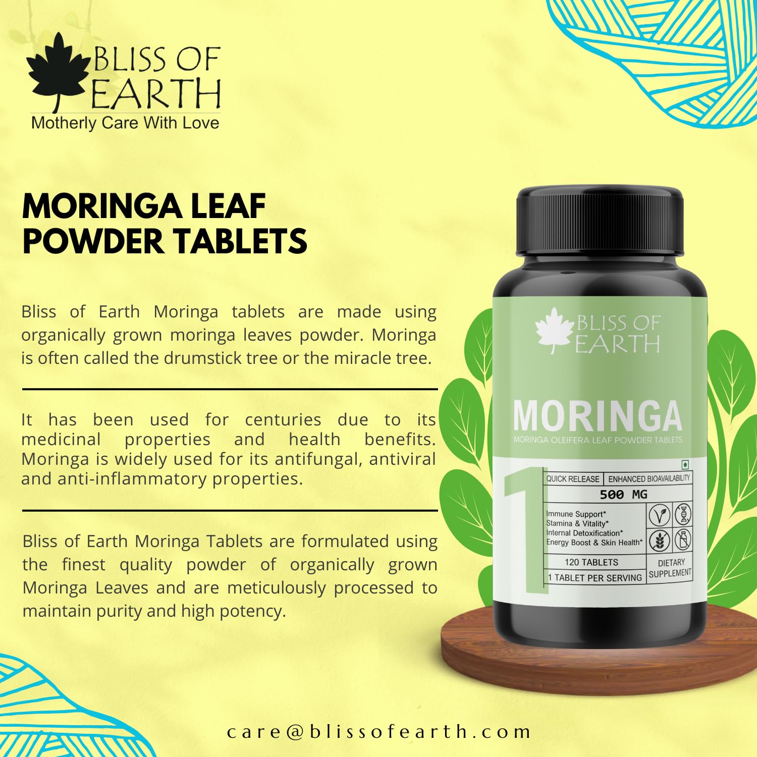 Experience the natural goodness of Moringa Oleifera with Bliss of Earth Moringa Tablets. Moringa often referred to as the "Miracle Tree" or "Drumstick Tree" has been cherished for centuries for its exceptional nutritional value and numerous health benefits. These 500mg Moringa tablets offer a convenient and potent way to enrich your daily wellness routine.