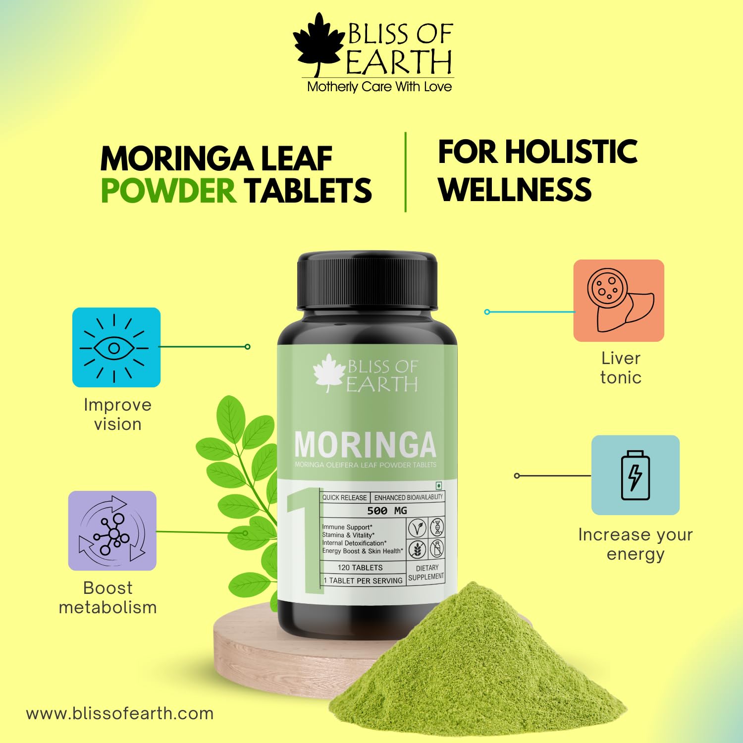 Bliss of Earth High Purity Moringa Oleifera Tablets 500mg With Quick Release & Enhanced Bioavailability Green Superfood Supplement 120 Tablets