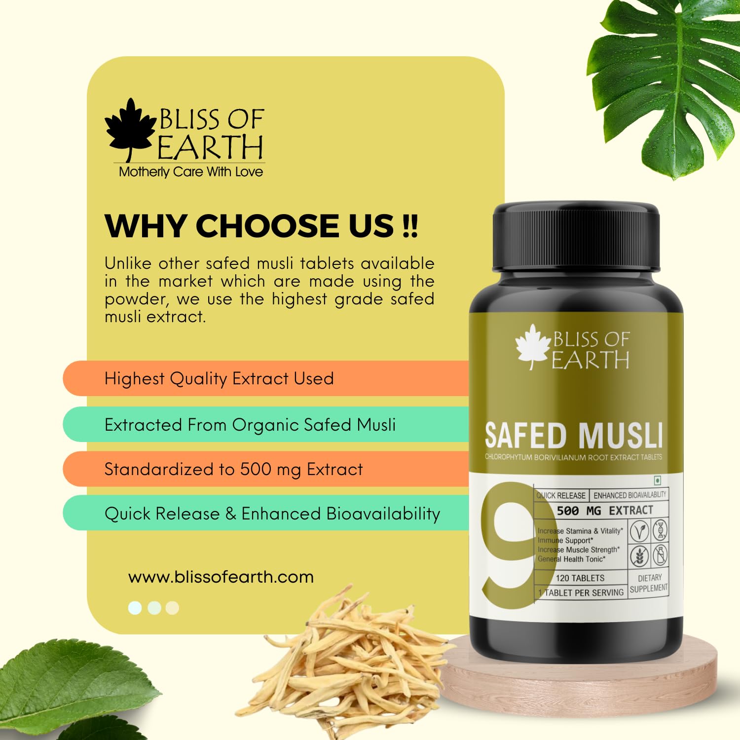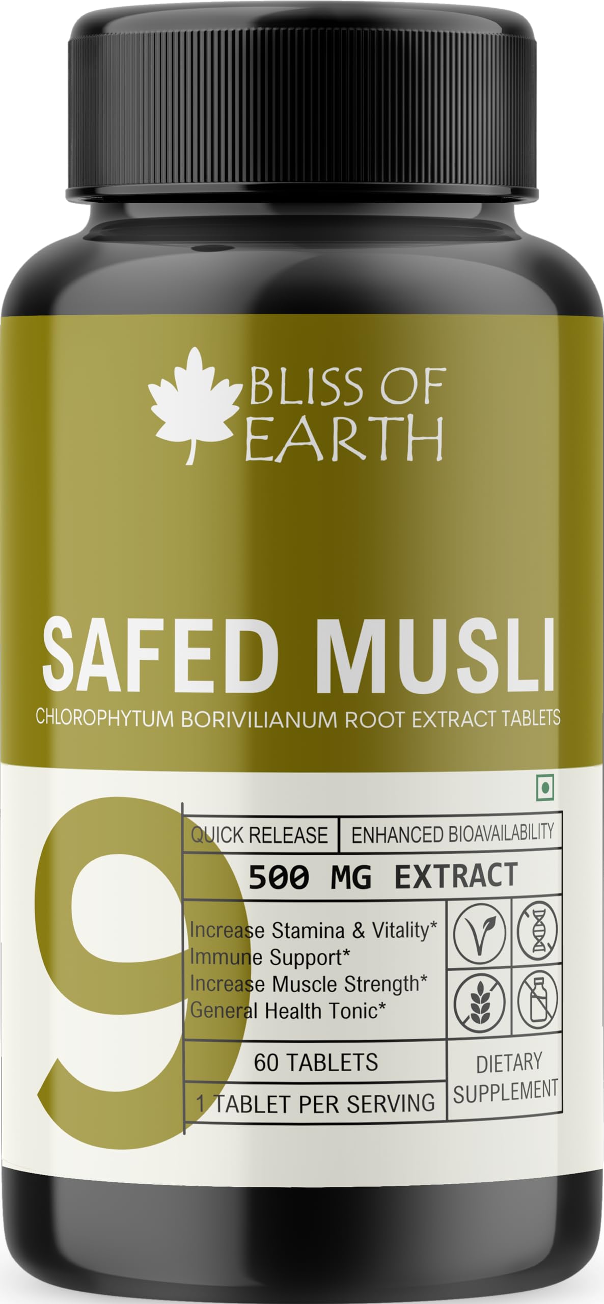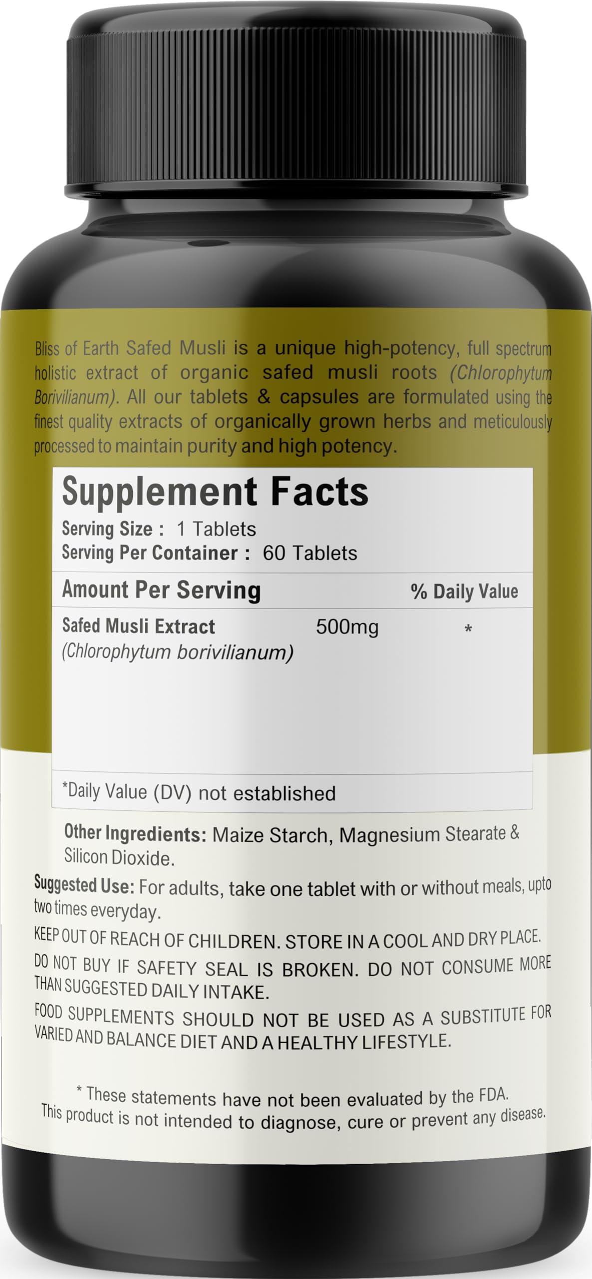 Bliss of Earth Safed Musli Tablets 60 Count 500mg Pure Extract Per Serving For Energy and Vitality