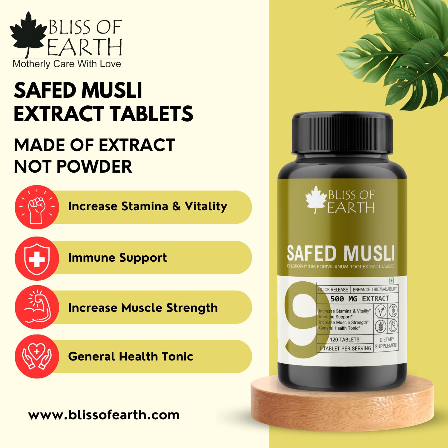 Revitalize Your Health Revitalize your health with Bliss of Earth Safed Musli Extract Tablets. Boost your energy improve stamina and enhance vitality with our all-natural formula. Experience the benefits of improved immune function and take charge of your wellness today! Natural and Effective Our Tablets contain pure Safed Musli extract a potent herb known for its aphrodisiac and rejuvenating properties. Packed with essential nutrients these Tablets support overall health and well-being. Elevate your physical and mental performance with Bliss of Earth Safed Musli Extract Tablets. Embrace a healthier lifestyle now!