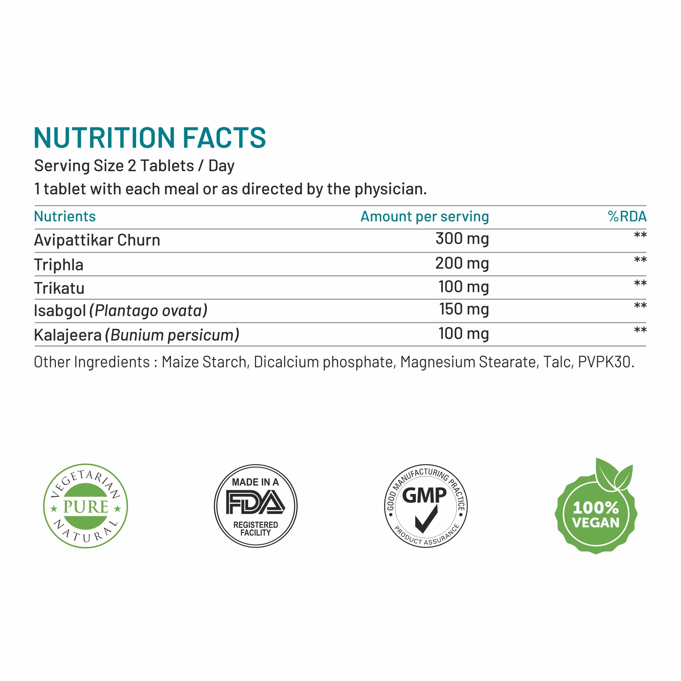HELP IMPROVE GUT HEALTH: High Potency Ayurvedic ingredients like Triphala Trikatu Isabgol Avipattikar Churn & Kalajeera extracts help improve digestion & aid against bloating and heaviness.